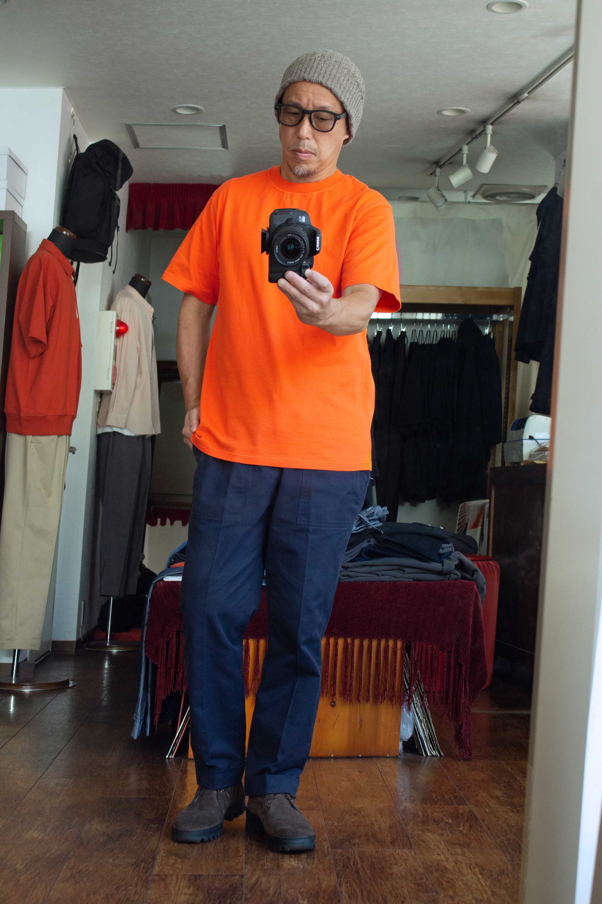 こちらはYonetomi New Basic Garment Dyed T-shirt 95-242-035になります。生地にはアメリカ産のコットンとオーストラリア産のコットンをブレンドしたものを度詰めに編んだものを使用。一般的に強度がありドライな肌触りのアメリカンコットンに、白度に優れ滑らかな肌触りが特徴のオーストラリアコットンをブレンド。しっかりとした生地感ながらも滑らかな肌触りに柔らかさもあり且つ透けにくく、インナーとしてのTシャツと、アウターとしてのTシャツ両方に求める機能を兼ね備えたブランド渾身のオリジナル生地になります。デザインは首元にはニット(横編)のマシンによって編まれたパーツを馴染みのいいシングル付けにし、通常のTシャツと同様にタコバインダーで縫製。その仕様により洗い込むことでヨレてきてしまうTシャツの弱点を軽減させ、また身頃部分と生地感が違うニットパーツが浮いてしまわないよう縫製仕様等を工夫し全体的に統一感ある見え方を演出。またパターンも袖山、肩幅、胸幅、着丈等バランスを意識し、デイリーなアイテムながらも綺麗な見え方になるよう計算。『インナーとしてのTシャツは少し透ける、ヘビーウエイトだと厚みがあってインナーとの兼用ができない』という悩みを解消した丁度良い生地の厚さや、デイリーに使える丁度良いサイズ感、ある一定の品質を保ちながら無理なく買い足せる丁度良いプライスと、Yonetomiがメゾンブランドの生産を手掛ける日本を代表するカットソーメーカーとの試行錯誤の上つくりあげた『丁度良いティーシャツ』を是非お試しください。