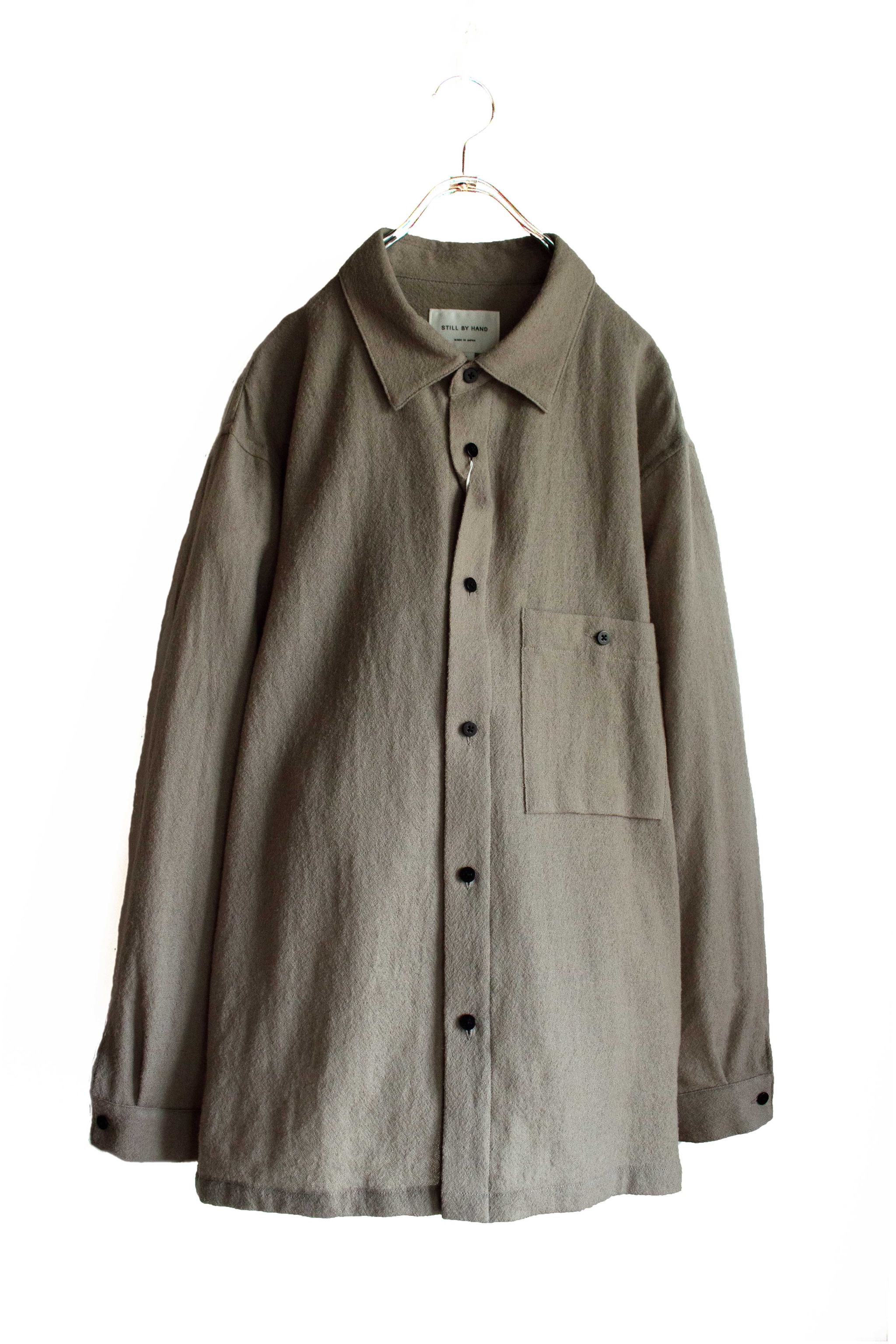 Still by hand ウールアムンゼンシャツ SH02244をアップしました。生地にはウール100%のアムンゼ生地を使用。ウール特有の暖かみのある表情に凸凹した表面、ちりめん生地みたいに軽くフワっとした生地感が特徴の生地になります。デザインはレギュラーカラーに裾は一直線のスクエアカットの仕様を採用し、シルエットはややゆったりとしたリラックスした雰囲気に。デザインはあえてシンプルにし、表情豊かな生地の雰囲気を前面にだした、カジュアルながらも品のあるウールシャツとなっております。是非お試しください。