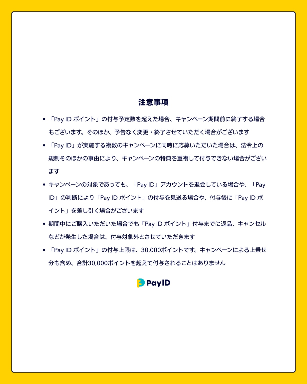 ※こちらのキャンペーンはPAY IDアプリ限定となります。PAY IDアプリを使って以外の「Webブラウザ」での注文においては、ポイントの獲得ができません。