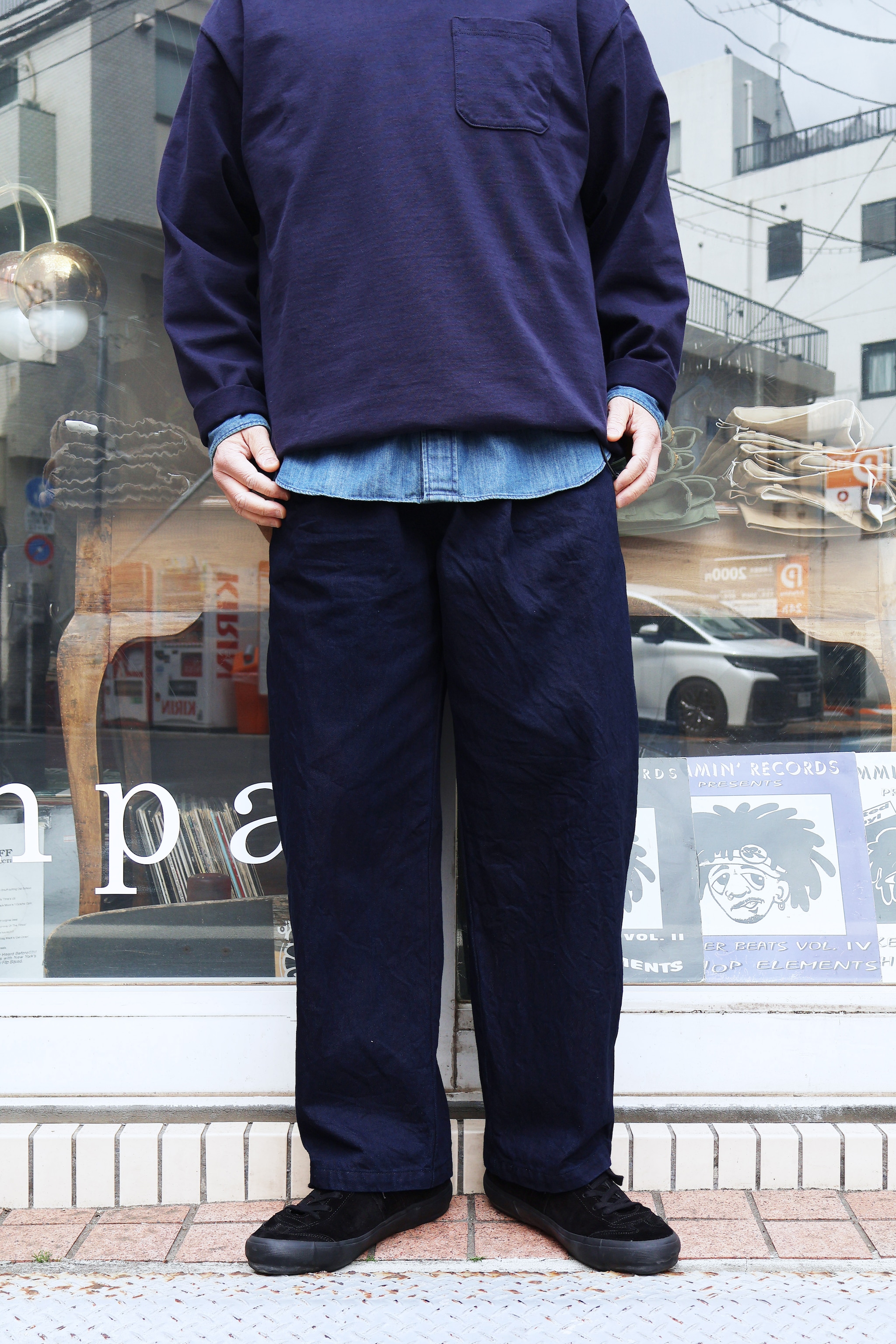 こちらはSTILL BY HAND ディープタックデニムパンツ DN03261になります。生地には経糸にレギュラーのコットン、緯糸はコットンの空紡糸を使用した11.5ozのブランドオリジナルのデニム生地を使用。(デニムジャケット DN04261と同素材)ややドライな肌触りに緯糸にグレー糸を使用する事により、少しグレーがかった深みのある色が特徴的なデニム生地になります。デザインはやや深めに入ったタックに、丸みのあるゆったりとしたシルエットを採用。またステッチやカン止めを同系色で沈ませる事によりミニマムな見え方を演出。デニムパンツ特有のカジュアル感がありながらも、STILL BY HANDらしい洗練された雰囲気のある絶妙なパンツに仕上がっております。是非お試しください。