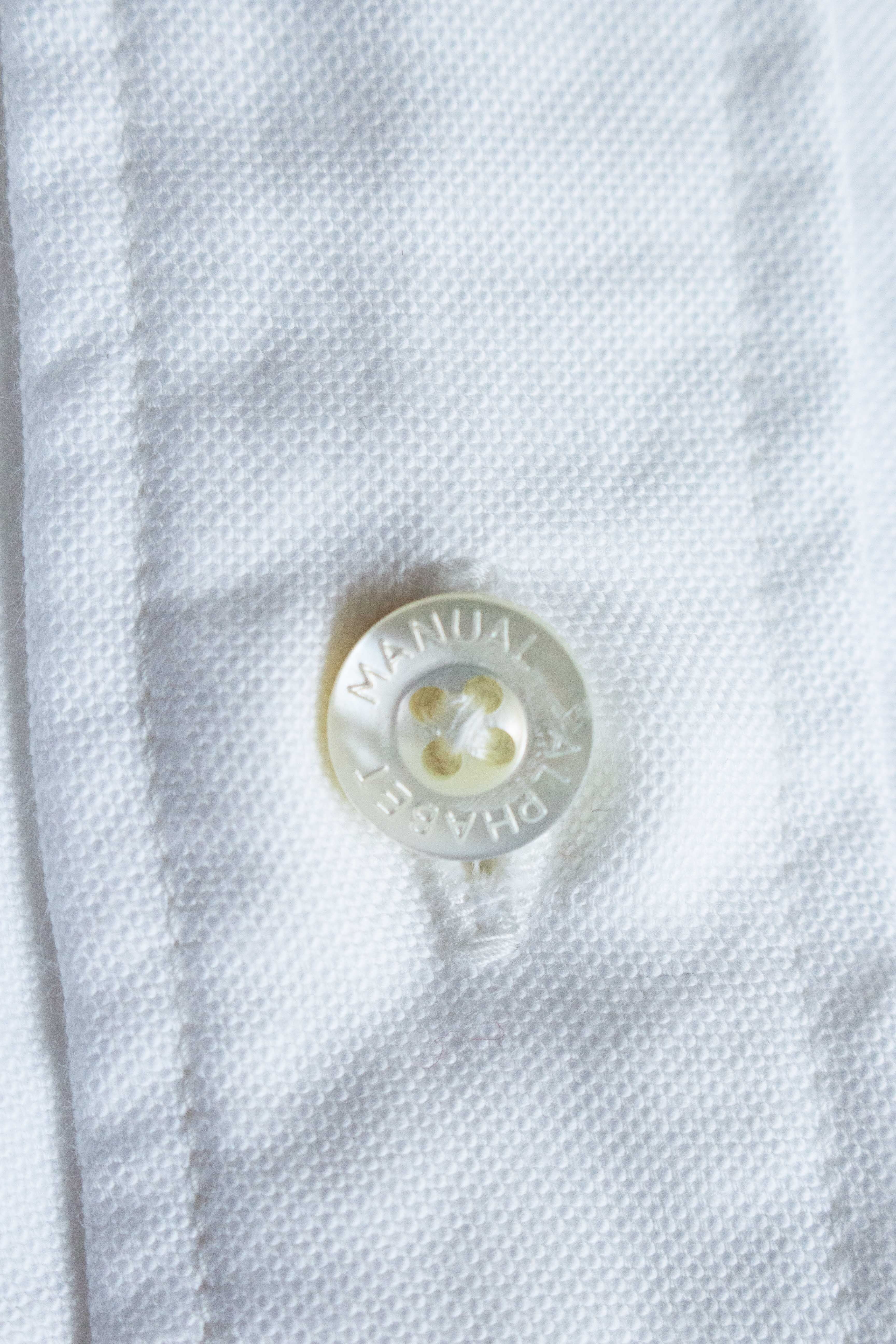 こちらはMANUAL ALPHABET SUPIMA OX BD SHIRTS BALGING FIT(ややゆったり) BASIC-BG-001になります。生地には世界三大綿の一つであるスーピマコットンのオックス地を使用。上品な光沢にしなやかなで柔らかい風合いが特徴の生地になります。デザインはいわゆるボタンダウンをベースに襟はクラシックなボタンダウンよりもやや低めに設定し、様々なスタイルに対応可能。またヨークはやや狭めにしボックスプリーツを配す事により着心地の良さを実現。ボタンは国産の高瀬貝に刻印をいれたオリジナルボタンを使用し、更に縫製はドレスシャツ専門の大阪の工場で裁断から縫製まで自動機等を使わず、熟練の職人が一枚一枚丁寧に縫製。シルエットはややゆったりしたシルエットに丈の長さはタックイン、タックアウト両方とも対応できる長さに設定と、これだけの拘りがありながらもプライスは日本製とは思えないくらいリーズナブルなものとなっております。是非お試し下さい。