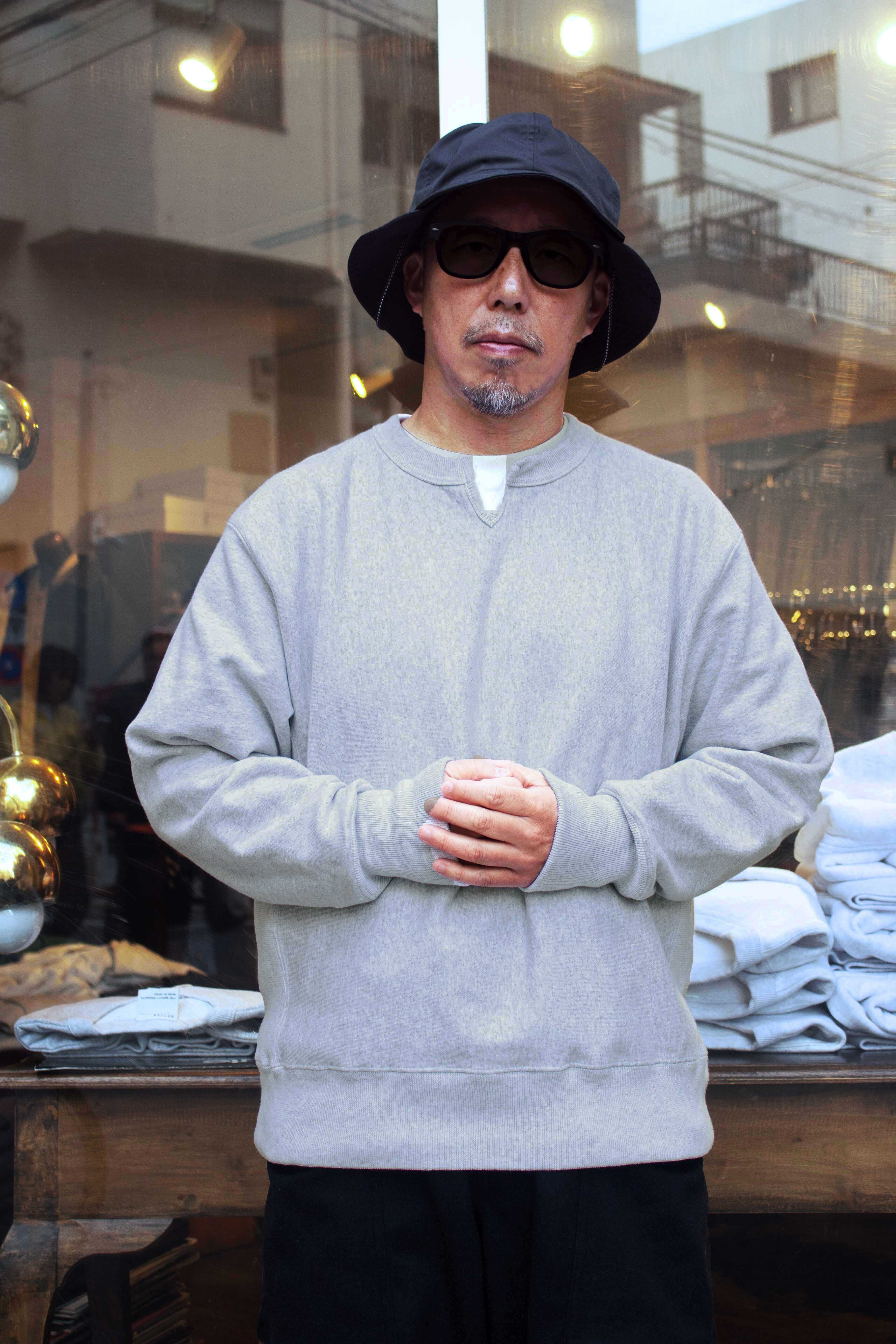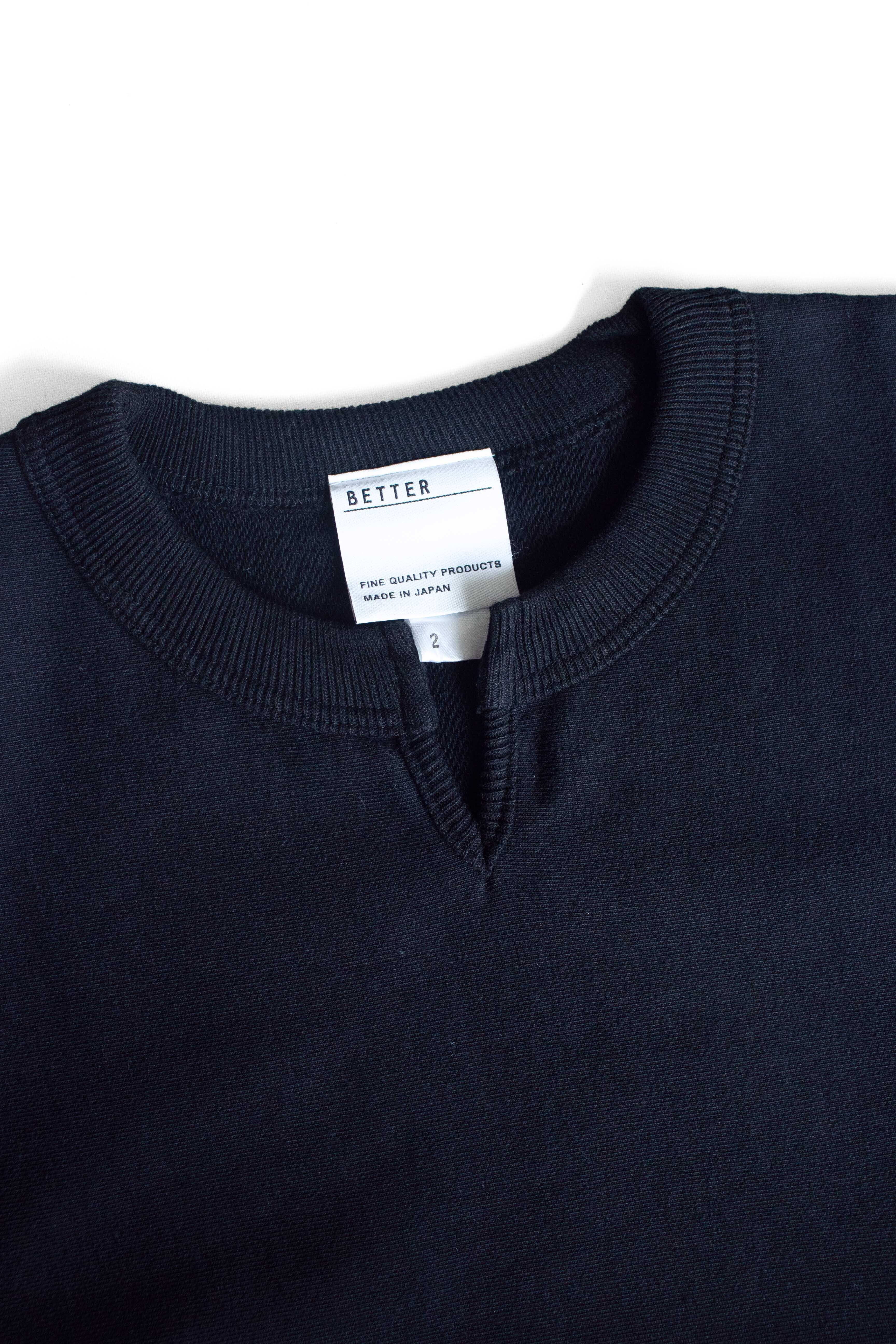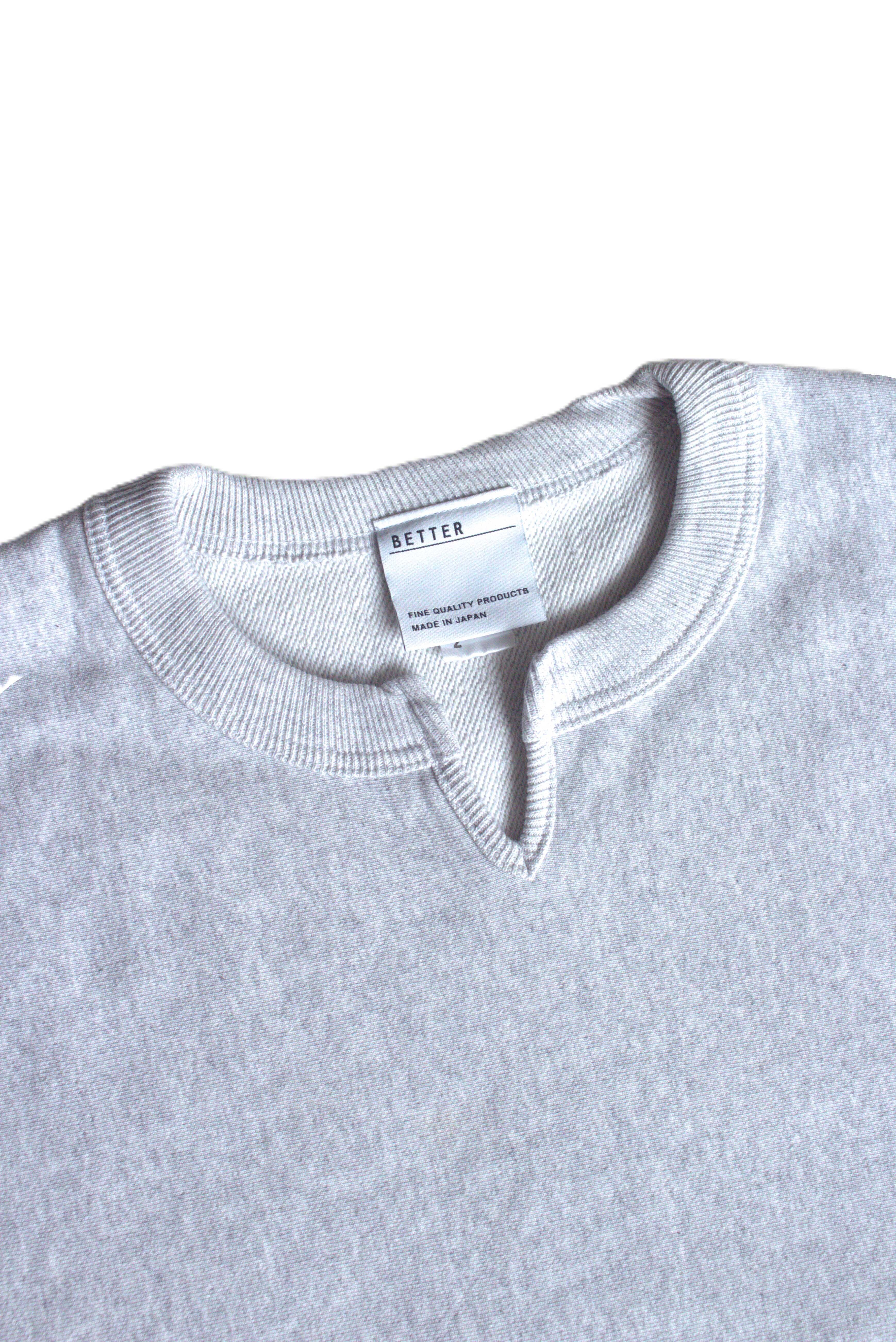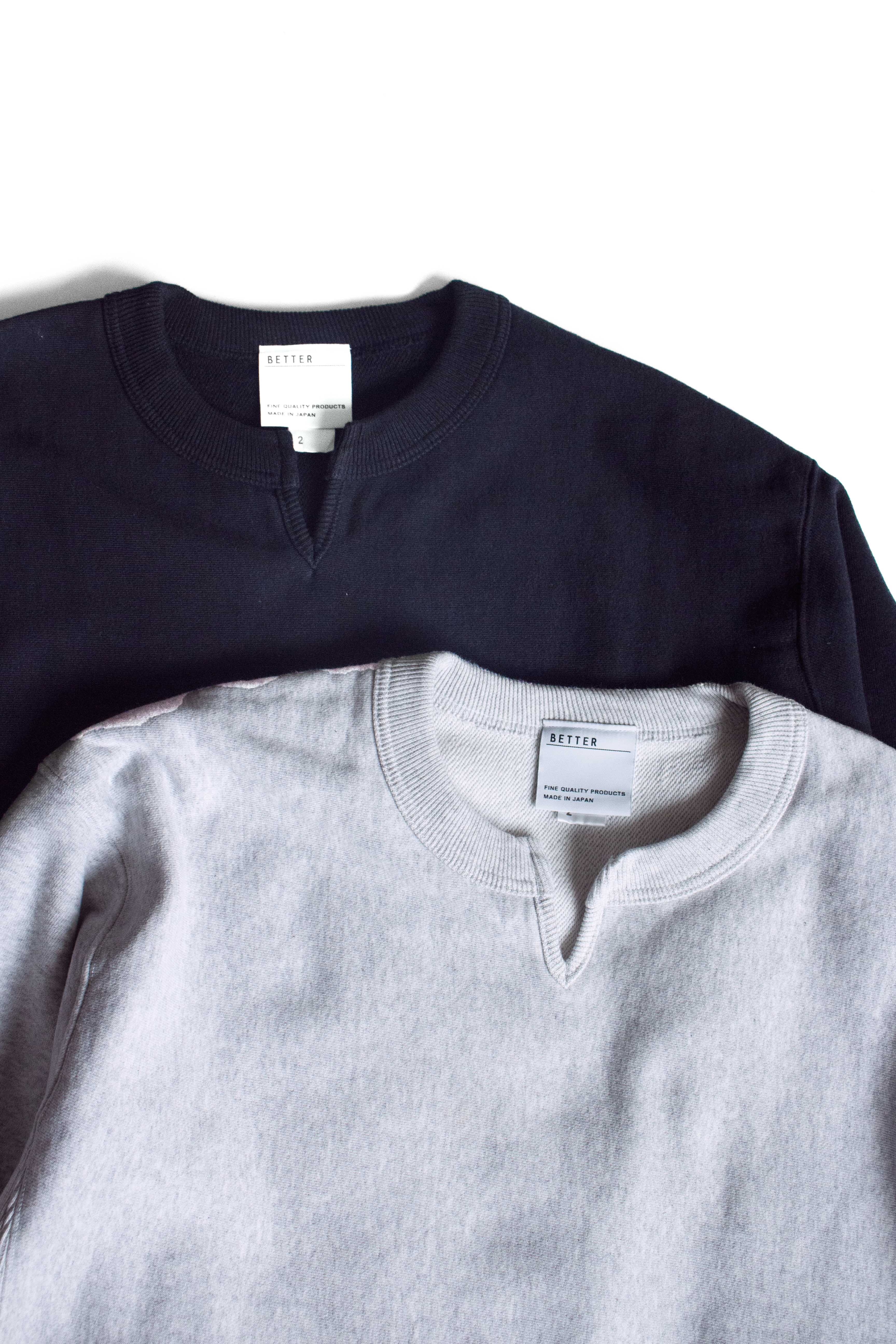 こちらはBETTER VINTAGE FLEECE KEY NECK PULLOVER BTR2525になります。生地には空紡糸を使用したコットン100%の裏毛素材を使用。適度な肉感、しっかりしたハリ感があり、表面はドライなシャリ感のある手触りが特徴の生地になります。デザインはいわゆるチャンピオンのスウエットをモチーフにシルエットはゆったりとし、身頃は生地を横目に使用し、脇をリブ素材で切り替えたリバースウィーブ仕様を採用。また袖口のリブは折り返して着用できるよう長めに設定。更に首元はセンターに切り込みを入れたキーネックデザインを採用しアクセントに。単なるチャンピオンのレプリカに終わらない、『やり過ぎず、やらな過ぎず』のBETTERらしい味付けのスウエットに仕上がっております。是非お試しください。