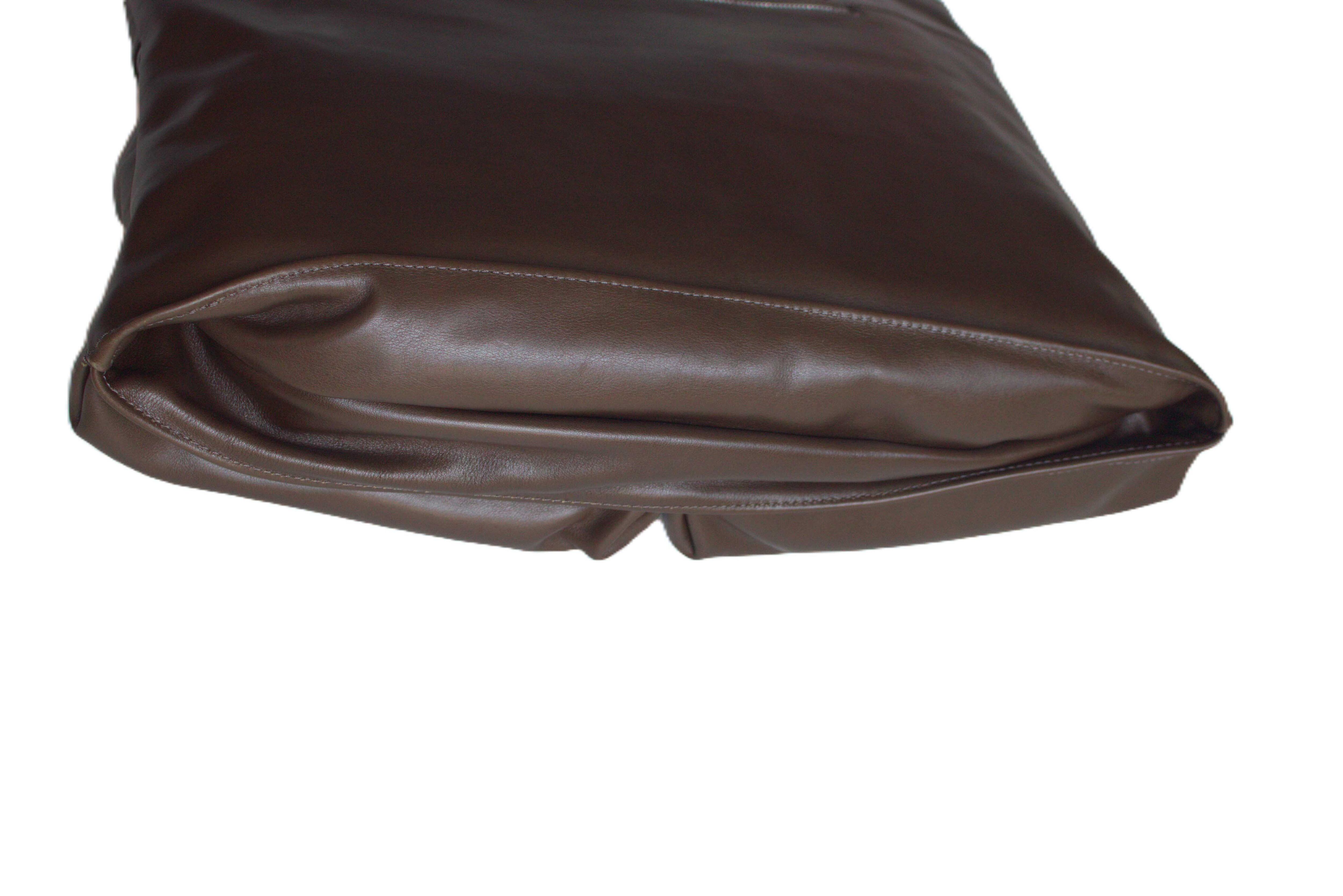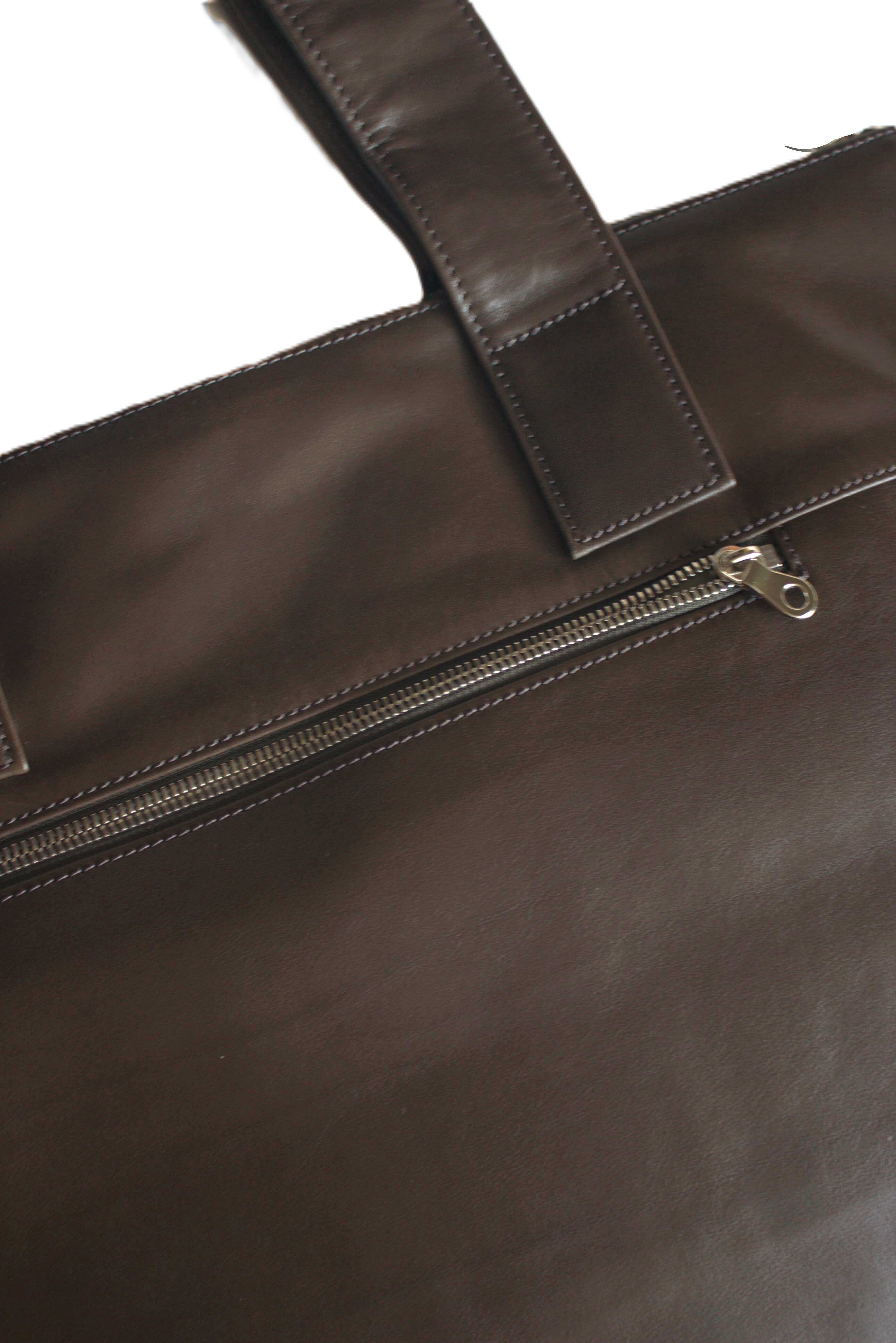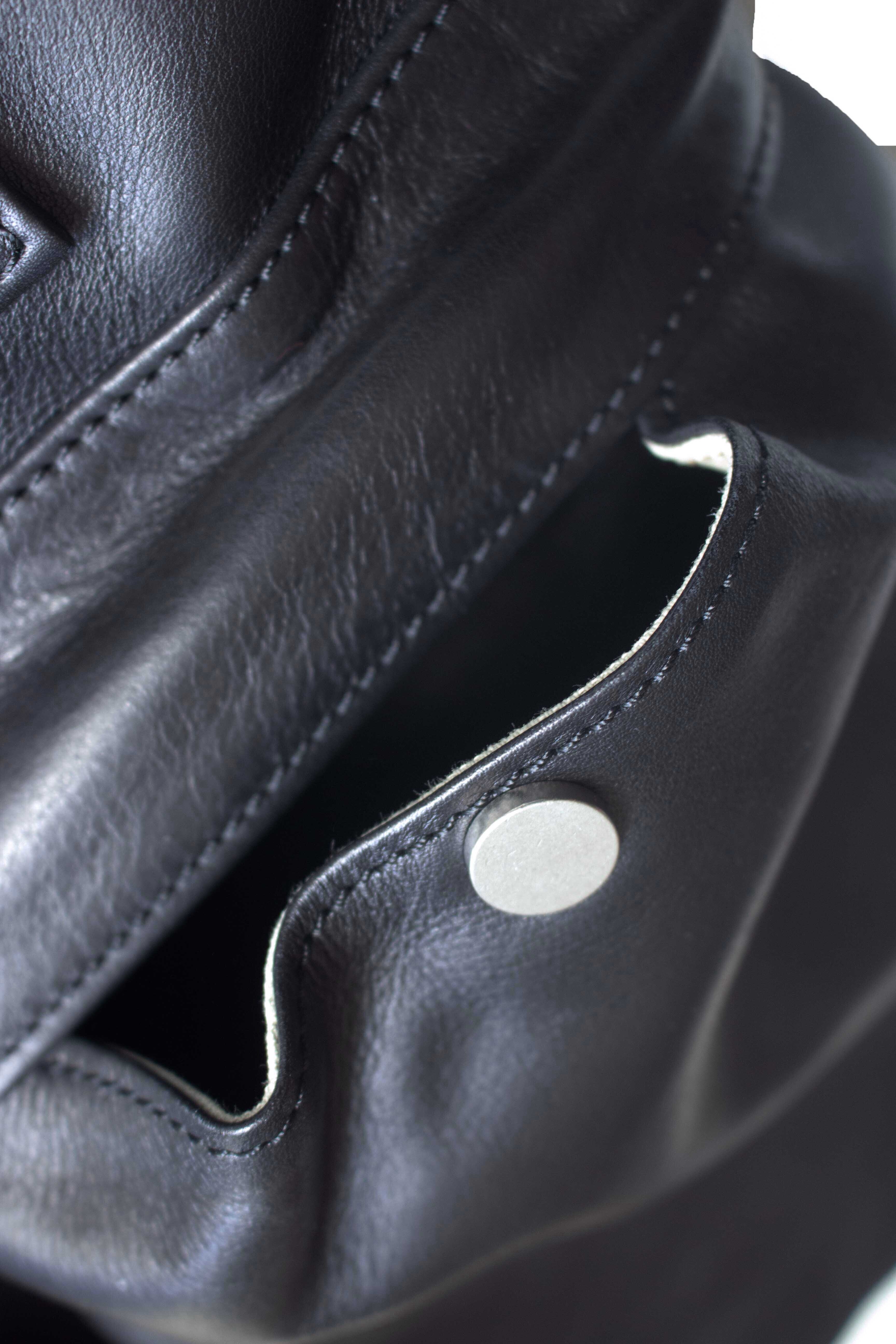 デザインはアメリカ軍のヘルメットバッグをモチーフに、メインにはMac Book Pro 16インチサイズが楽々入る容量に設定しジッパーにはYKKの中で最も高級で美しく最高峰のクオリティを誇るエクセラを使用。また表面には500mlのペットボトルが縦に入る大きめのフロントのスナップポケット2つ配し、裏面は使い勝手の良いメイン同様にYKKエクセラを使用したジップポケットを装備。更に底はレザーを中に折り込んでマチを作るという、通常では考えられない非常に手間のかかる仕様をあえて採用する事により、見た目以上の容量と形状の美しさを実現。そしてハンドルは肩掛けできる長さながらも、手で持った際に地面に付かない上に、見た目のバランスを失わない絶妙な幅や長さを計算し設定。