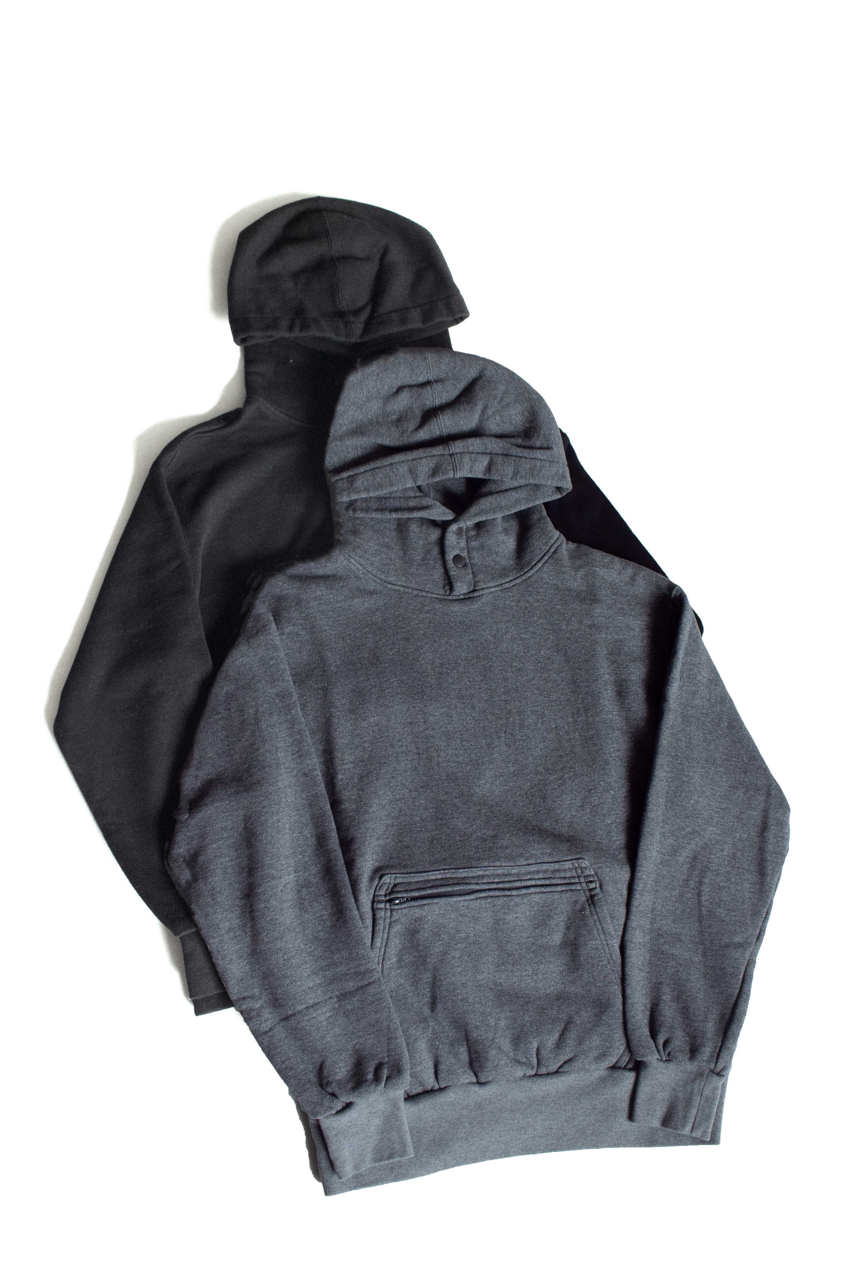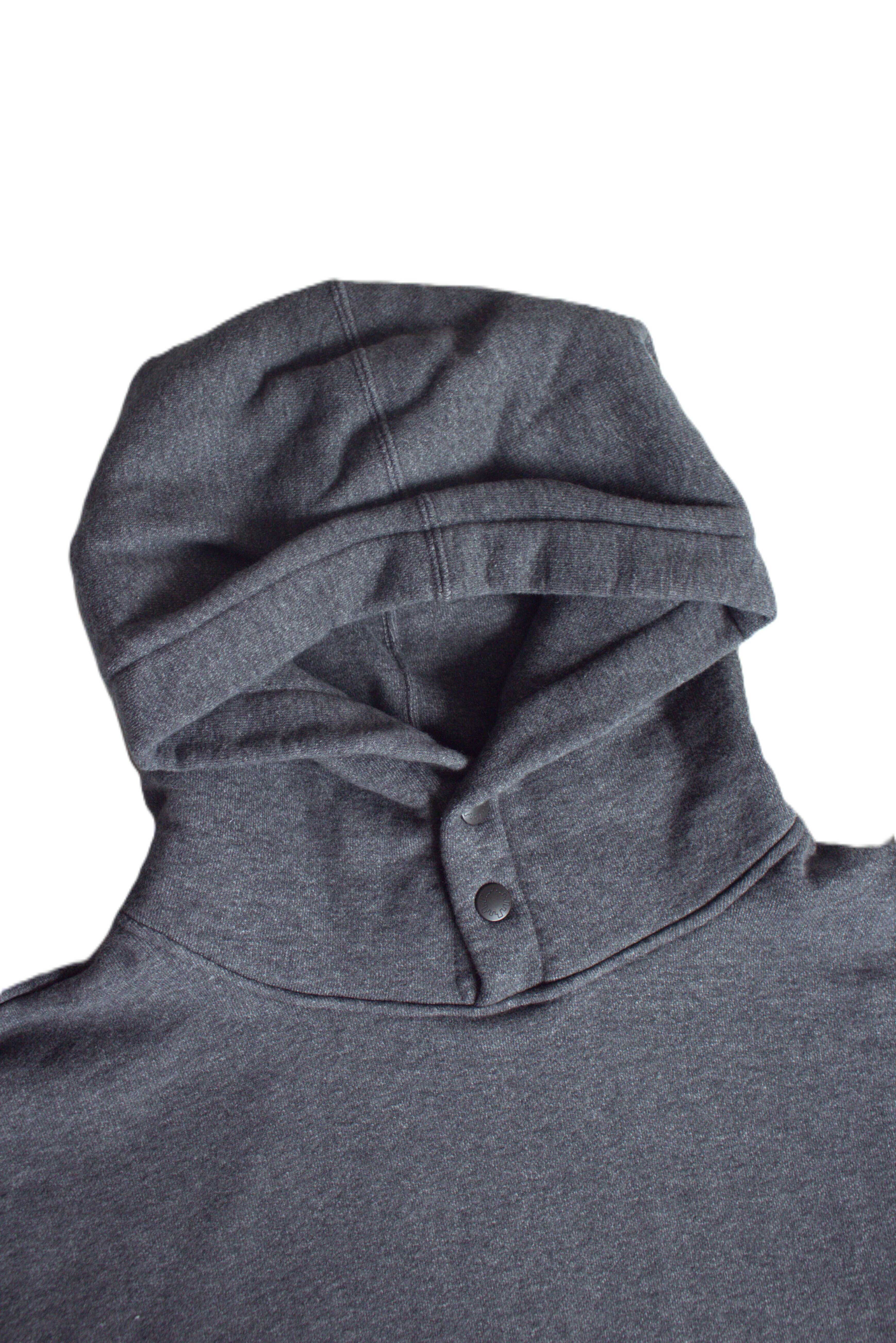 こちらはMODMNT HEAVY URAKE SWEAT HOODYになります。生地にはアズマ編み機で編んだ裏毛のスウエット生地を使用。アズマ編み機は70年代初期の編み機の一つで、今現在はかなり数が減っており大変希少な編み機になります。こちらは低速でゆっくり編むので一日の生産量も非常に少なく、ふっくらと空気を含んだ柔らかい肌触りながらも、適度にコシのある安心感ある生地は、今までに無い極上の着心地を約束いたします。デザインはややゆとりのあるシルエットに、首元にはスナップボタンを配し保温性を高めると共にデザインのアクセントに。また前見頃と後ろ見後の両方にカンガルーポケットを配し、前身頃の方はジップポケットとの二層構造の凝った仕様を採用。旧式の編み機でゆっくり編んだレトロで風合いの良い生地に、定番のデザインを採用しVINTAGE感を出すのではなく、あえて新しく面白いデザイン仕様を採用する事により生まれるバランス感が魅力手的なパーカーに仕上がっております。是非お試しください。