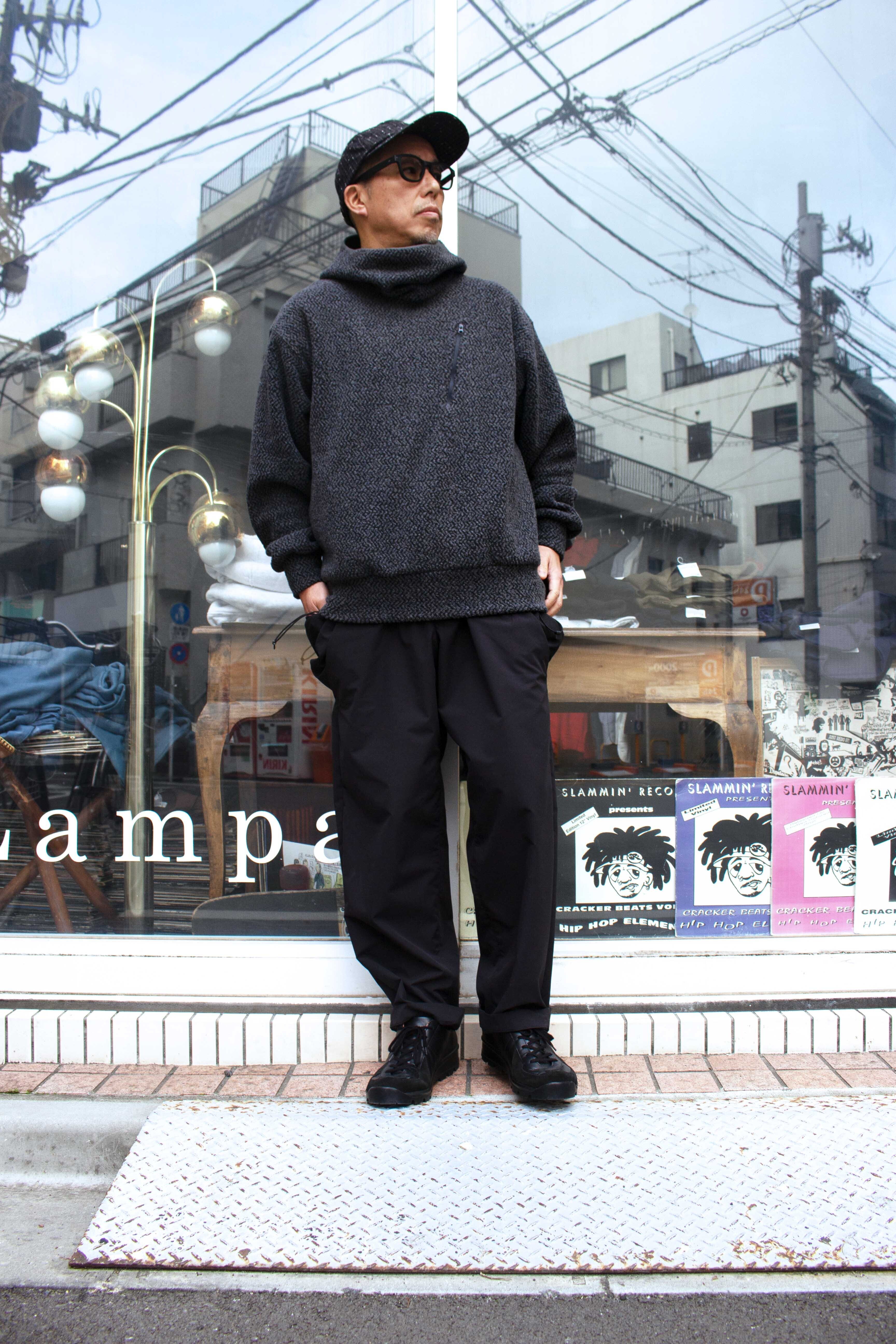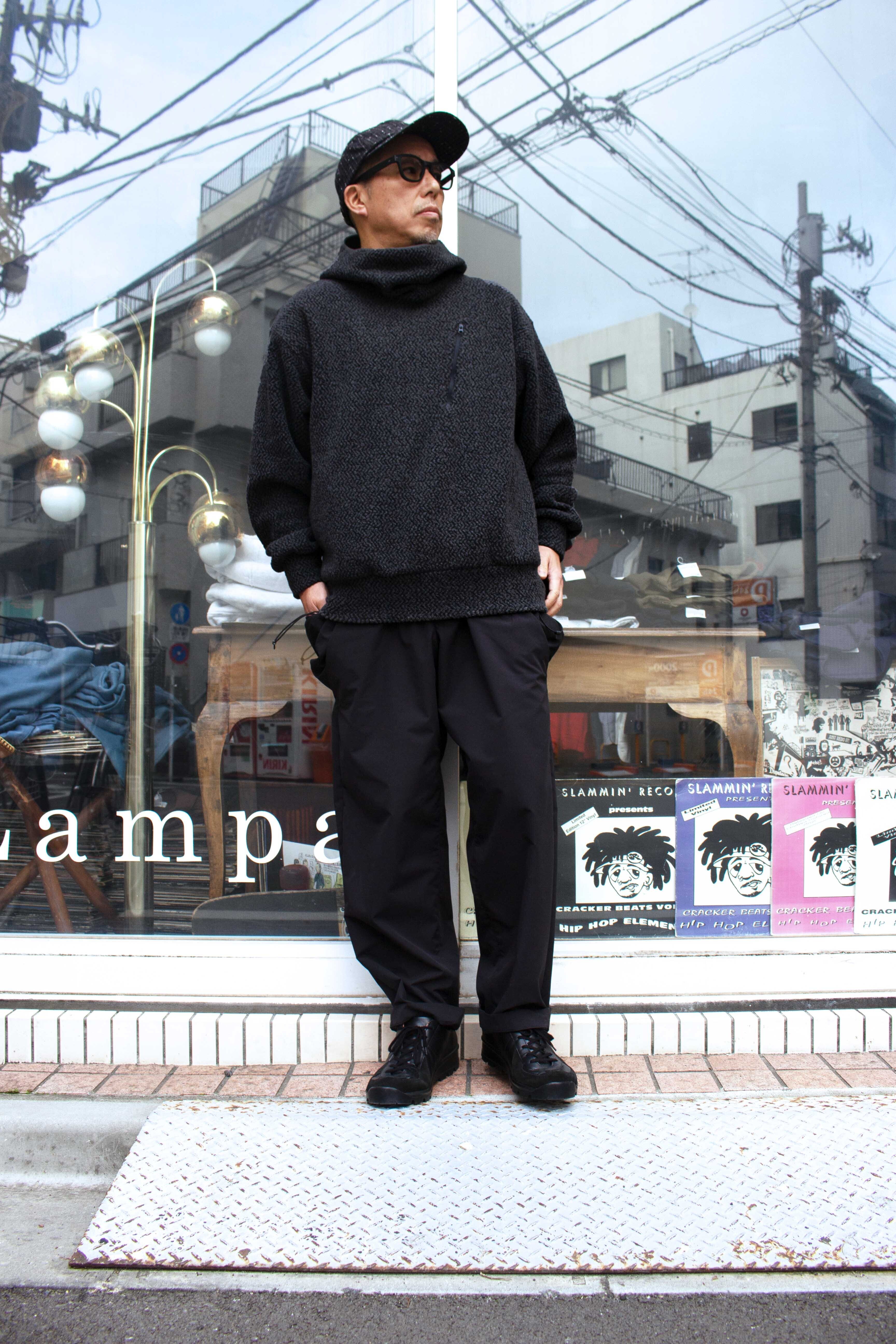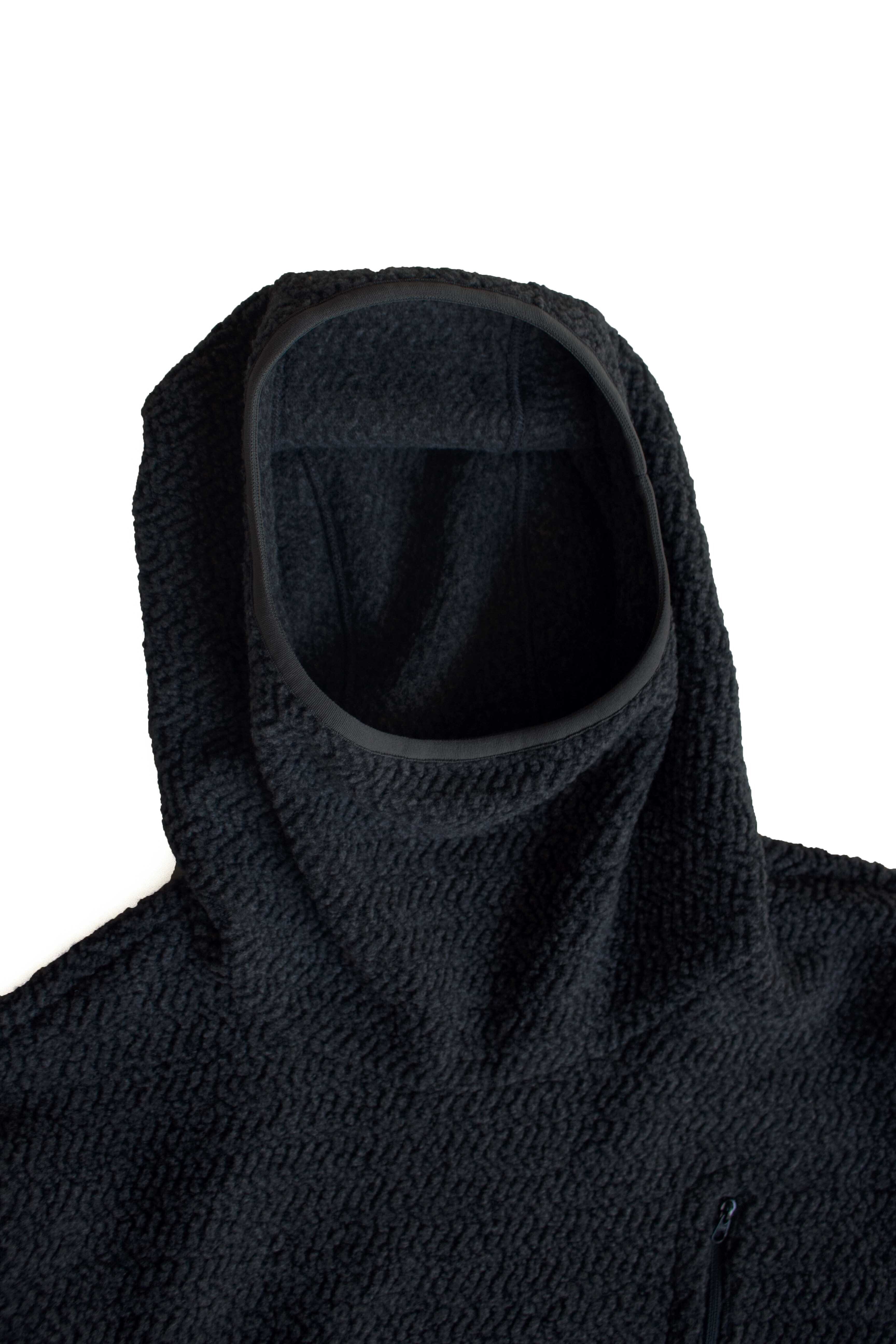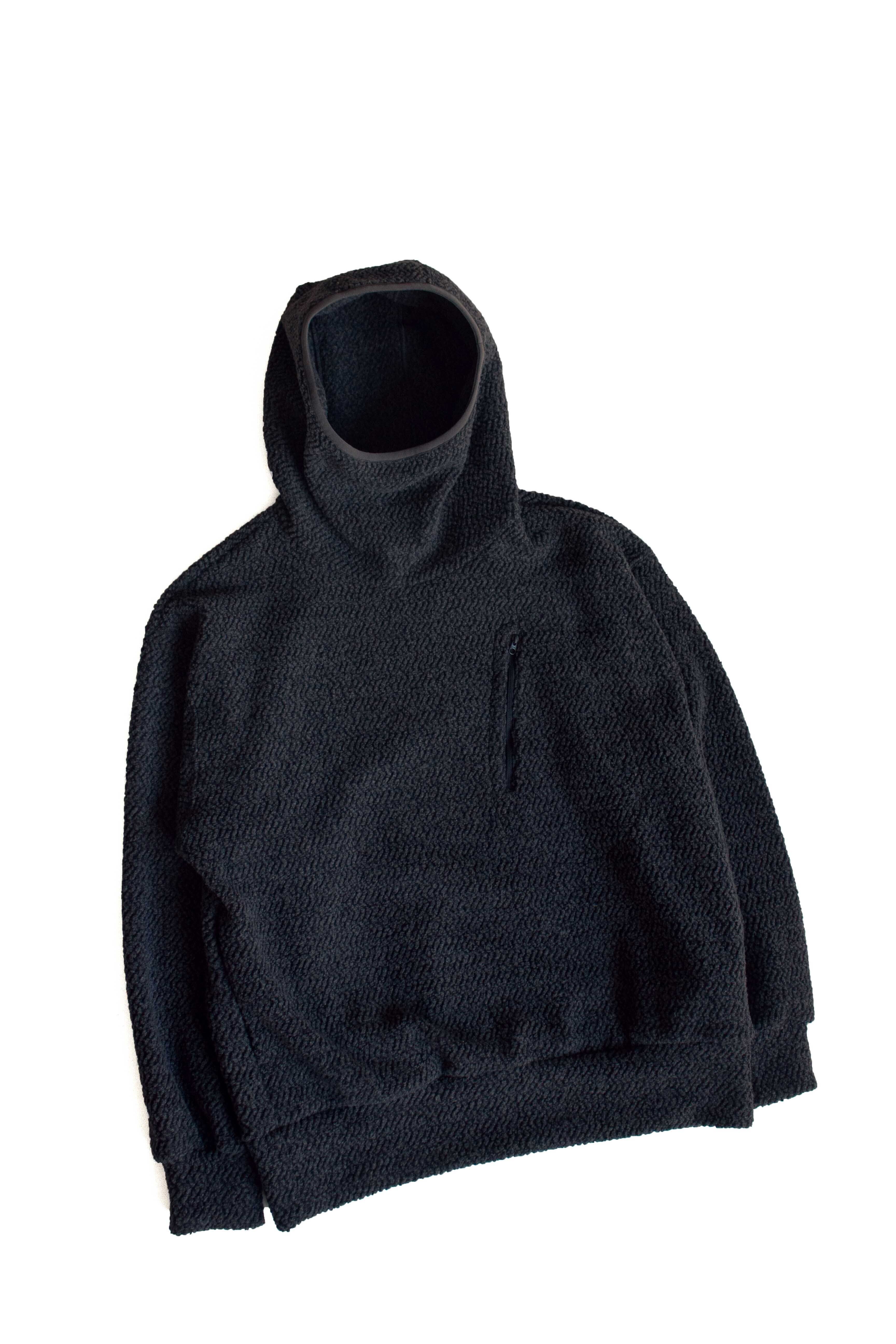 こちらはMODMNT HOODED TURTLE POPOVERになります。生地には150年近くウールリサイクルを続けてきたイタリア・CALAMAI社のリサイクルウールフリースを使用。再生ウールとマイクロ化繊糸をブレンドし、ボリューム感がありながらも軽く快適な着心地に加え、防臭性・保温性にも優れた生地になります。デザインは一般的なフードデザインでは無く、バラクラバ型のフードデザインを採用し独特な首周りの見え方を演出。また胸にはジップポケットを配し機能面を向上。アウトドアでよく見られるミドルレイヤーフリースをMODMNT流にアレンジした絶妙なバランス感のアイテムに仕上がっております。是非お試しください。