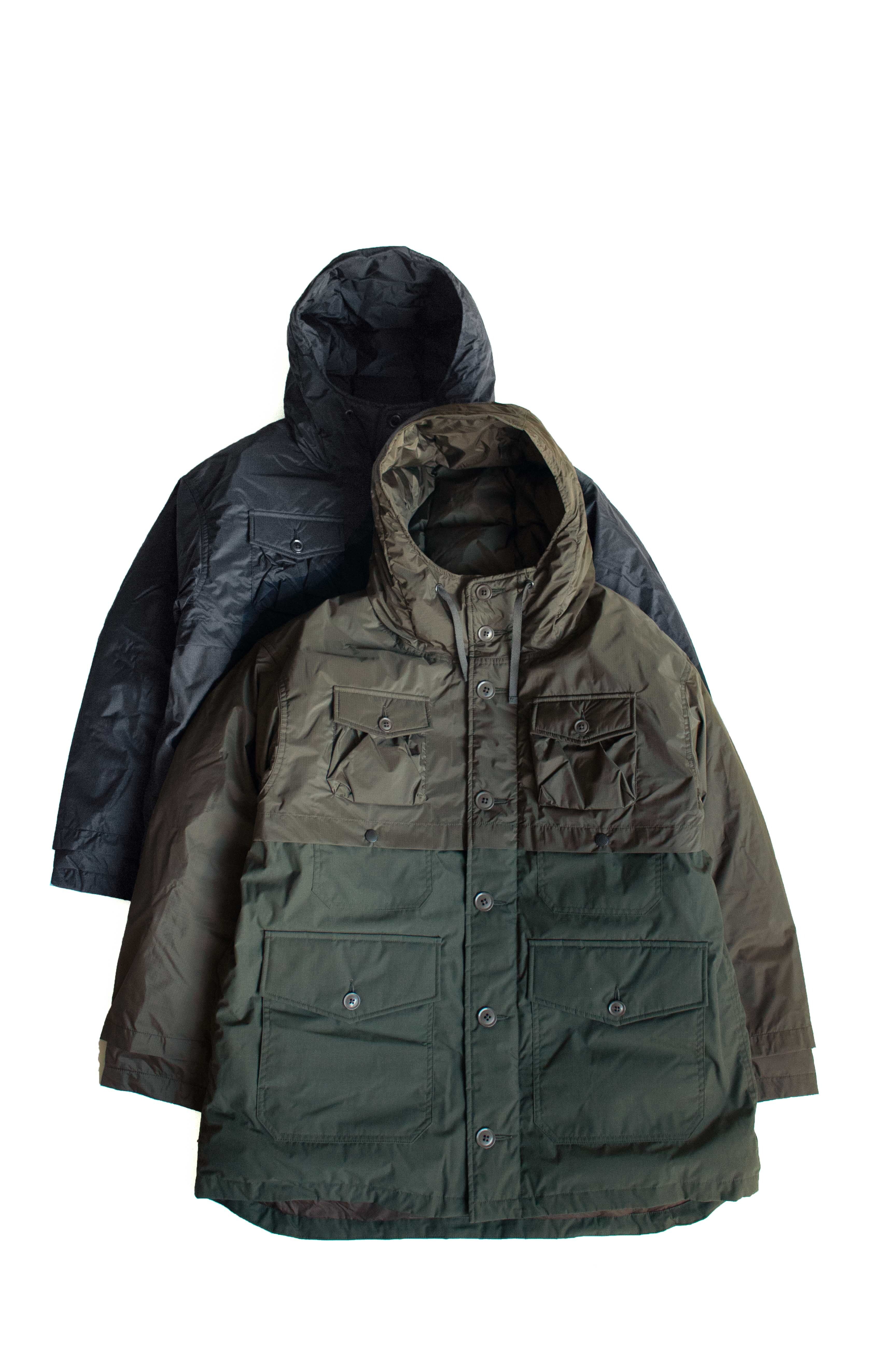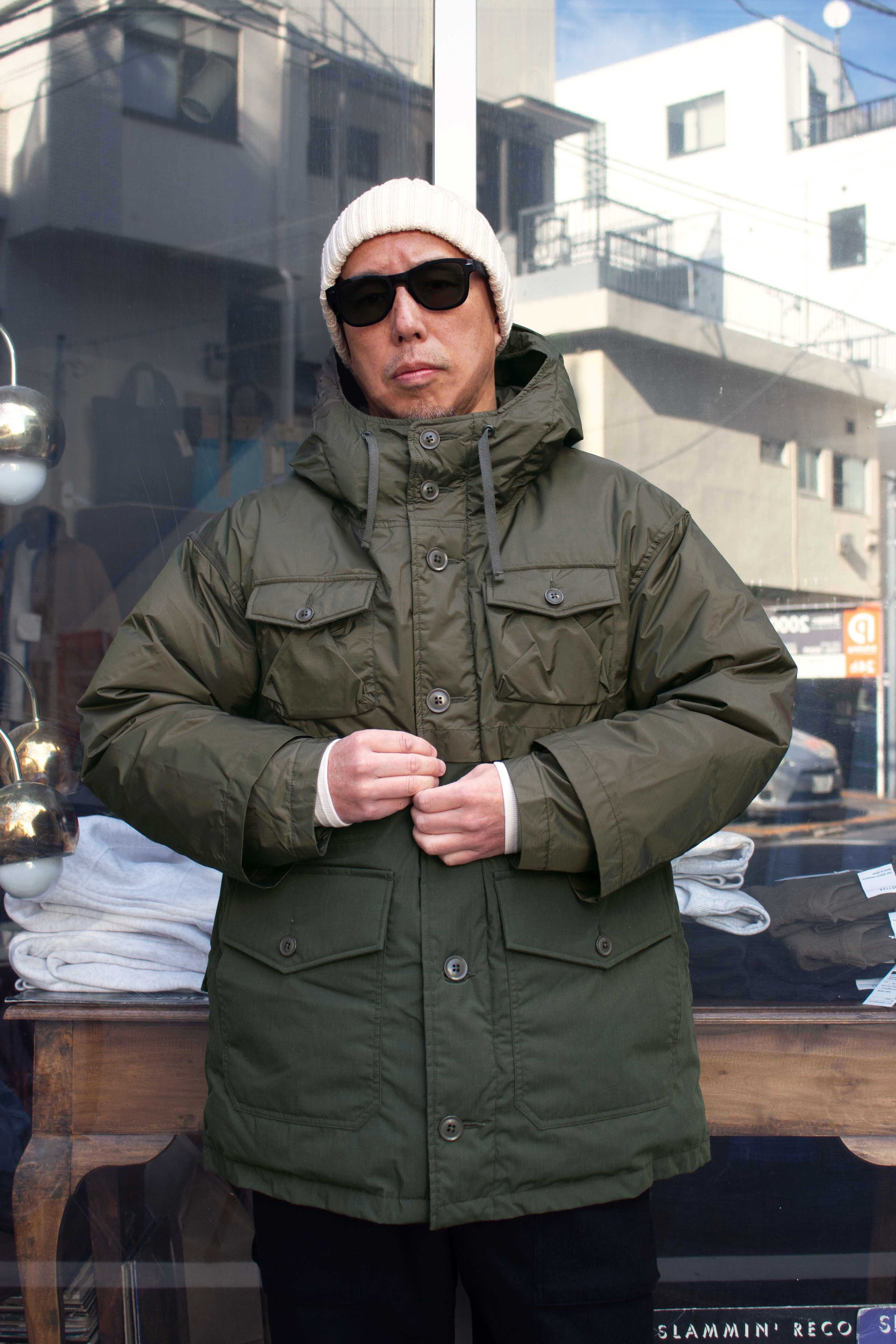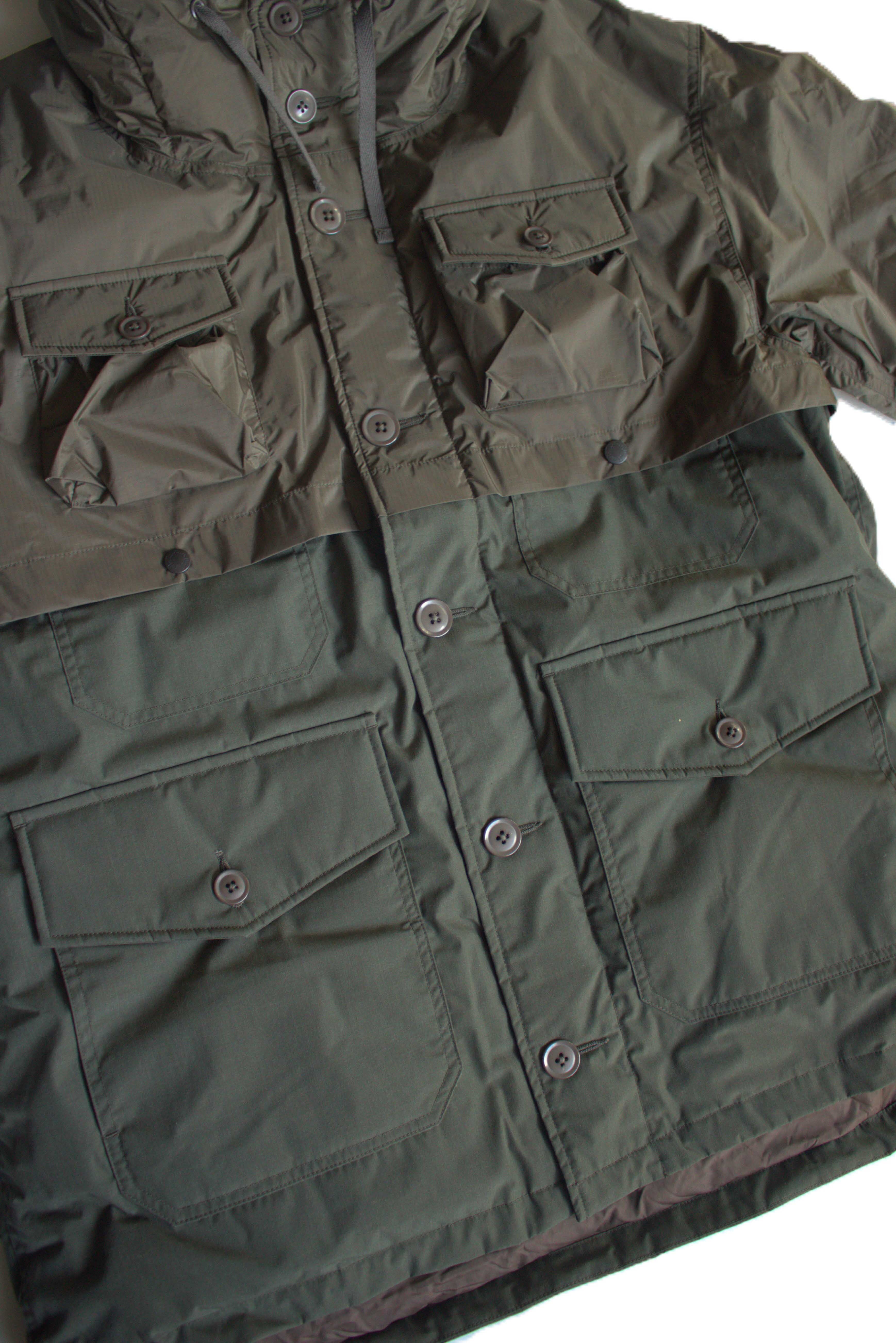 こちらはMODMNT SUPER MACKINAWになります。生地にはナンガ独自の高機能素材であるオーロラテックスを身頃上に、同じくナンガ独自の高機能素材であるヒノックを身頃下に使用。オーロラテックスは高い防水性、透湿性を持った高機能生地で、ヒノックは燃えづらく摩耗や引き裂きにも強い特徴を持ちながらも、ナチュラルな見え方が特徴の高機能生地になります。また使用されているダウンはスペイン産ホワイトダッグダウンを使用し高い保温性を実現。デザインはフィルソンの名作であるダブルマッキーノジャケットをベースにヒノックの上にオーロラテックスが重り、それぞれの素材と色のコントラストが面白いデザイン仕様に、各所に様々な形状のポケットを配し機能面の向上と共にアクセントに。更に背中にはジップポケットに裾部分にはフラップポケットを配した凝った仕様を採用。日本のアウトドアを代表するナンガのテクノロジーと、日本を代表するファッションデザイナーの鈴木大器氏のデザインが融合した、今までにないバランス感のクルーザーダウンジャケットに仕上がっております。是非お試しください。
