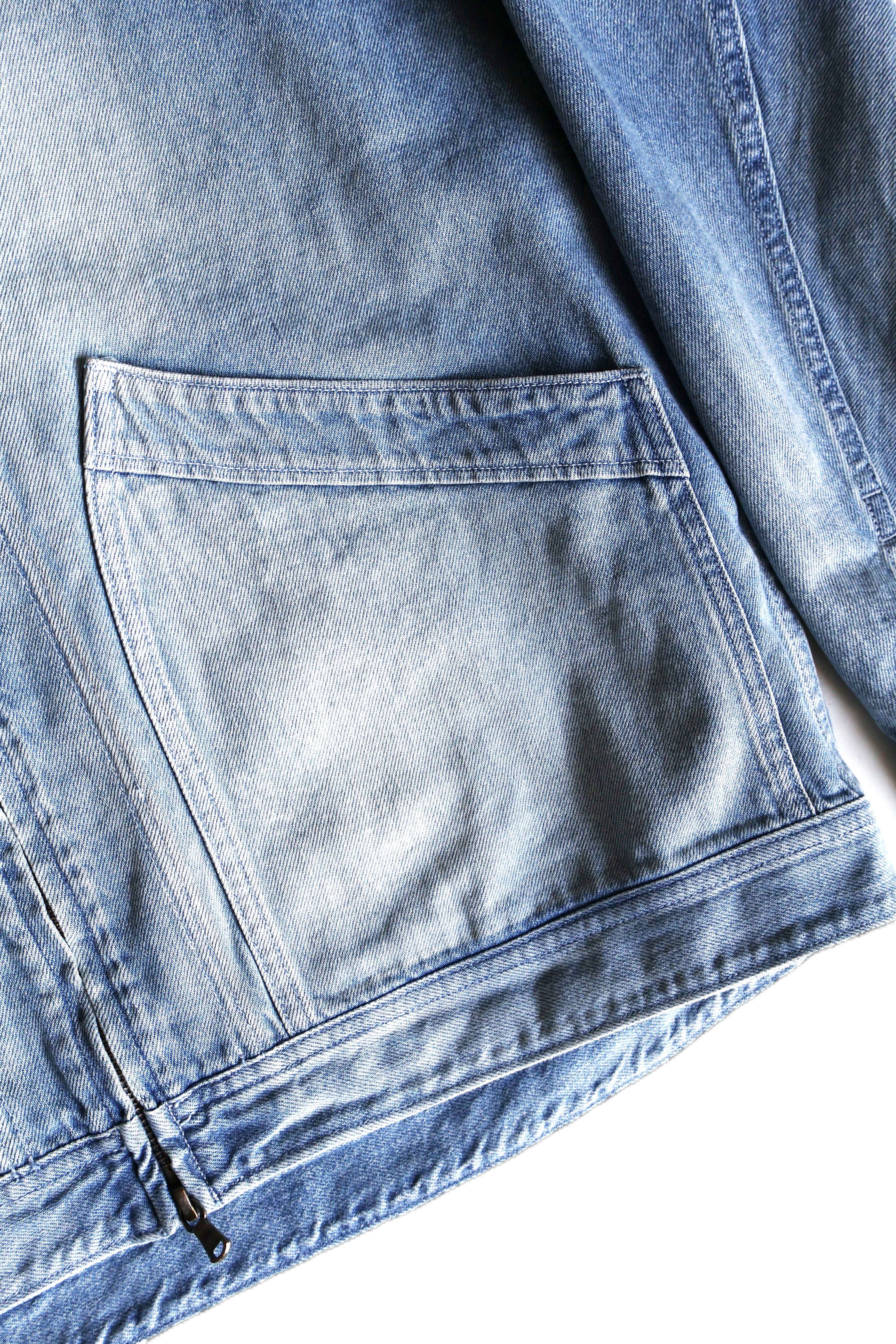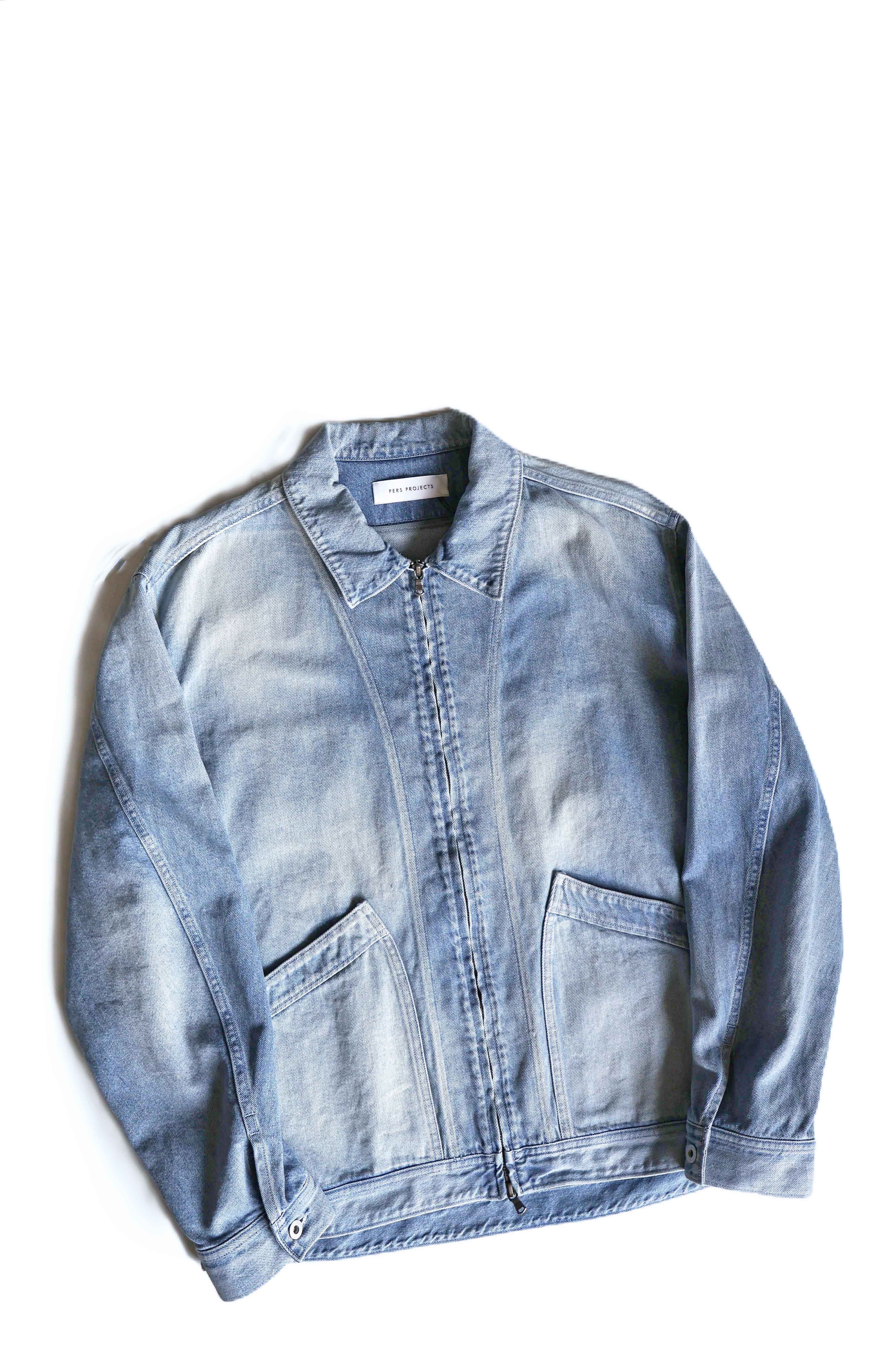 こちらはPERS PROJECTS FOUNTAIN FZ BLOUSON ANTIQUE WASHになります。生地にはムラ糸を使い縦横の糸の太さを変えることで、ミドルオンスでありながらフラットにならず、奥行きのある表情が特徴的なデニム生地を使用。デザインはVINTAGEのDENIM BLOSOUNをベースにしながらも、本来ついている胸のジップポケットや裾のタブを排除しミニマムな雰囲気にし、シルエットも本来のワーク感ある無骨な感じでは無く、やや角の取れた丸みのあるシルエットを採用。更に世界でも指折りの加工技術を持つ岡山は児島の職人の手作業により施されたUSED加工は好事家には堪らない仕上がりとなっております。世界的に評価の高い岡山の生産力を使用し、ワーク感あるデニムブルゾンを都会的な洗練されたものに仕上げたPERS PROJECTSらしいデニムブルゾンに仕上がっております。是非お試しください。