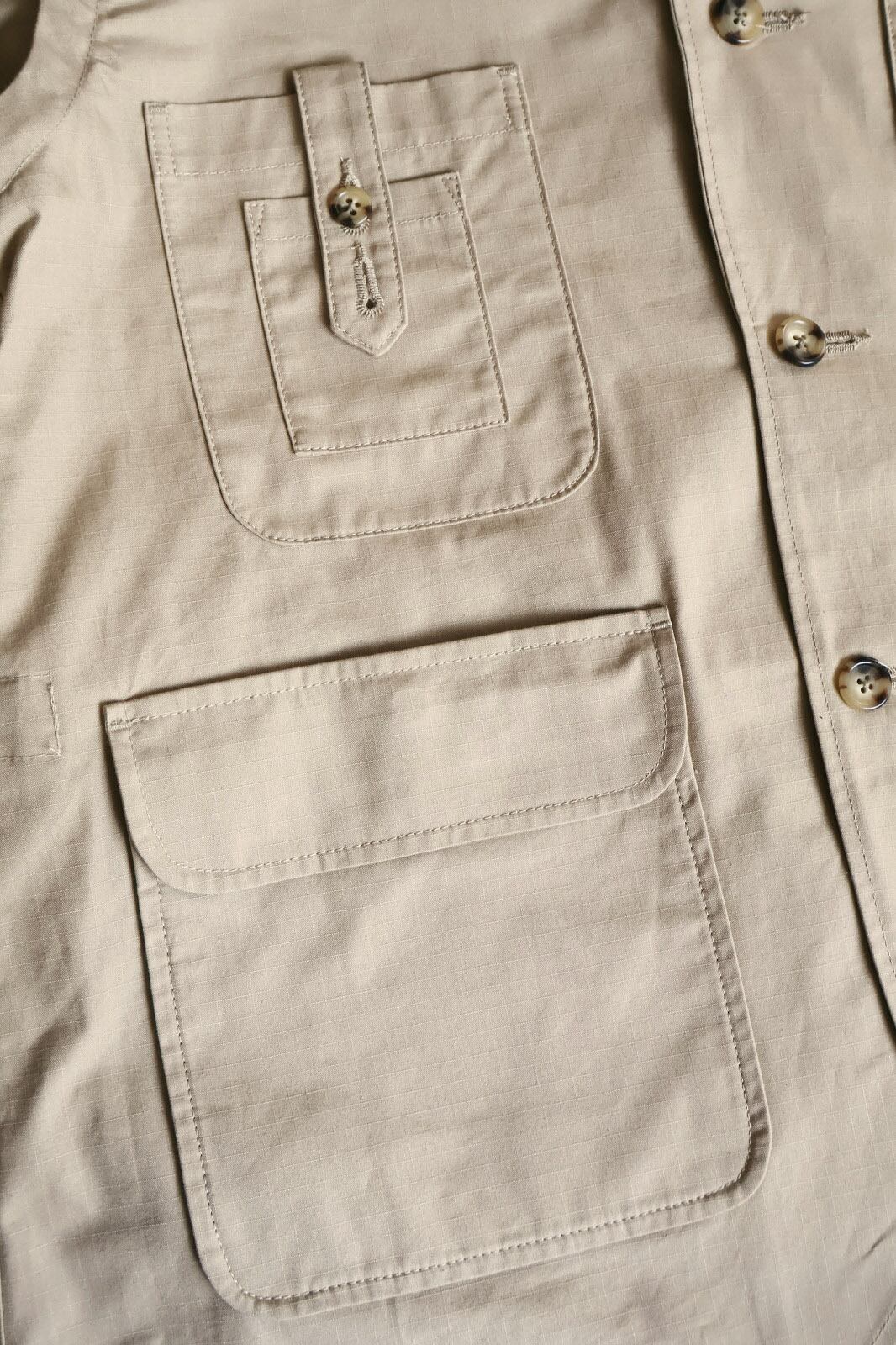 こちらはMODMNT TRAVEL JACKETになります。生地には経緯に強化糸を格子状に織り込んだリップストップ生地を使用。軽量で耐久性がありながらもコットン特有のナチュラルな風合いが特徴の生地になります。デザインは70年代にイタリアのBRIONIがアメリカのTWA航空の為に特別にデザインしたトラベルジャケットをソースに、前身頃には様々な形状のポケットを配し、背中には着脱可能なハンティングポケット、また首周りのフードと袖も着脱可能となっており、様々なスタイルやシチュエーションに対応可能。オリジナルの単なる焼き直しではない、都会的な大人の男のシティーラギッドウェアを是非お試し下しさい。