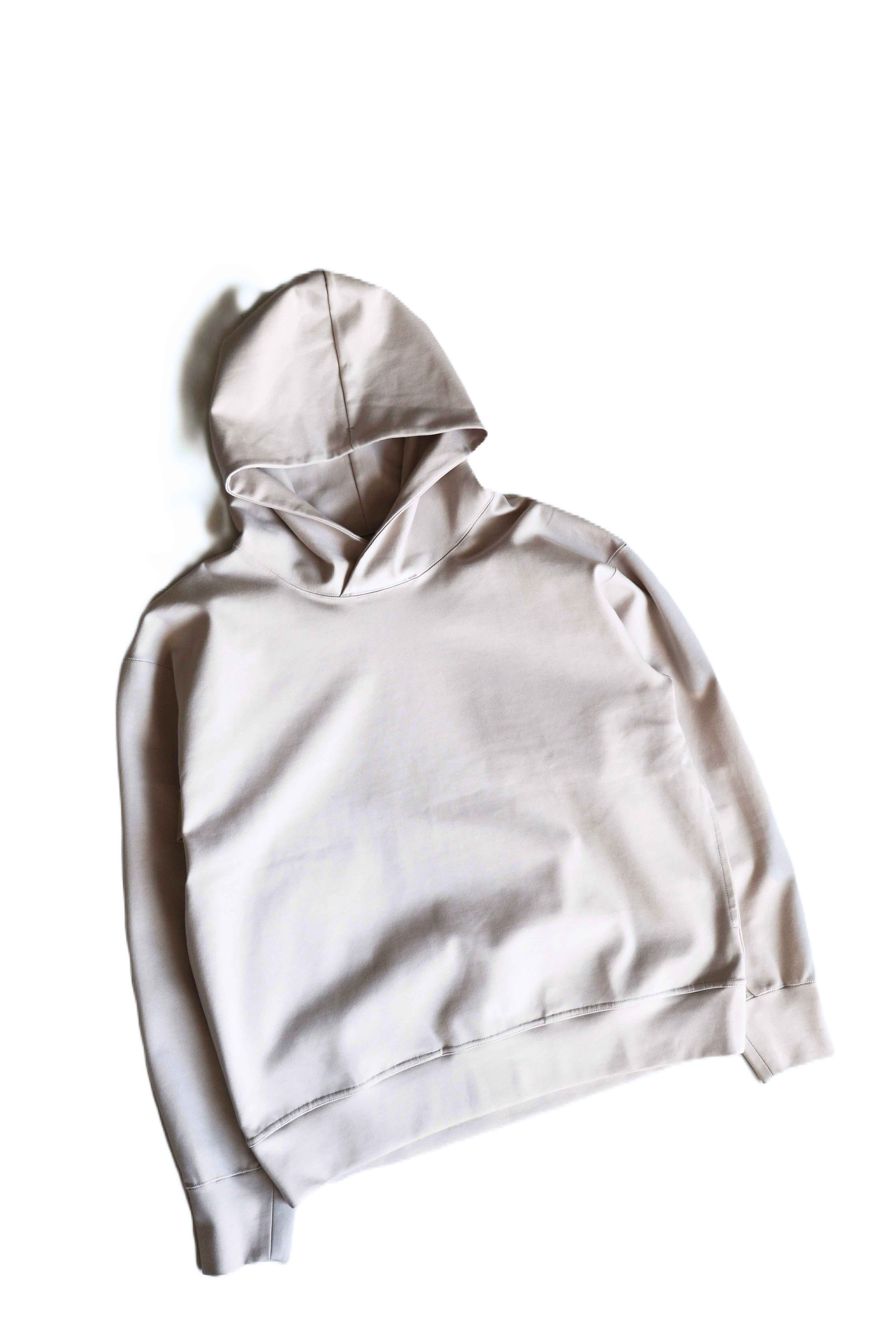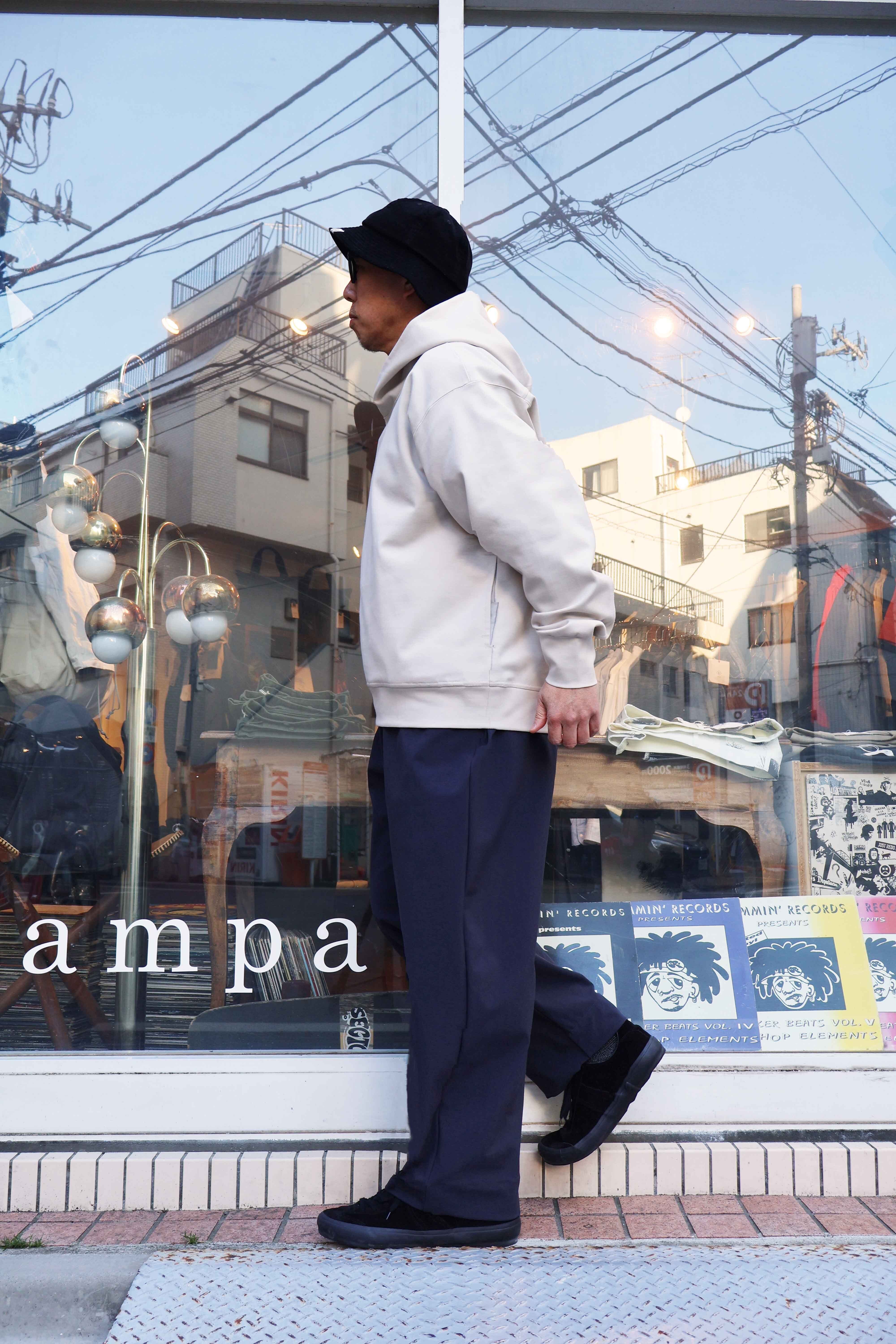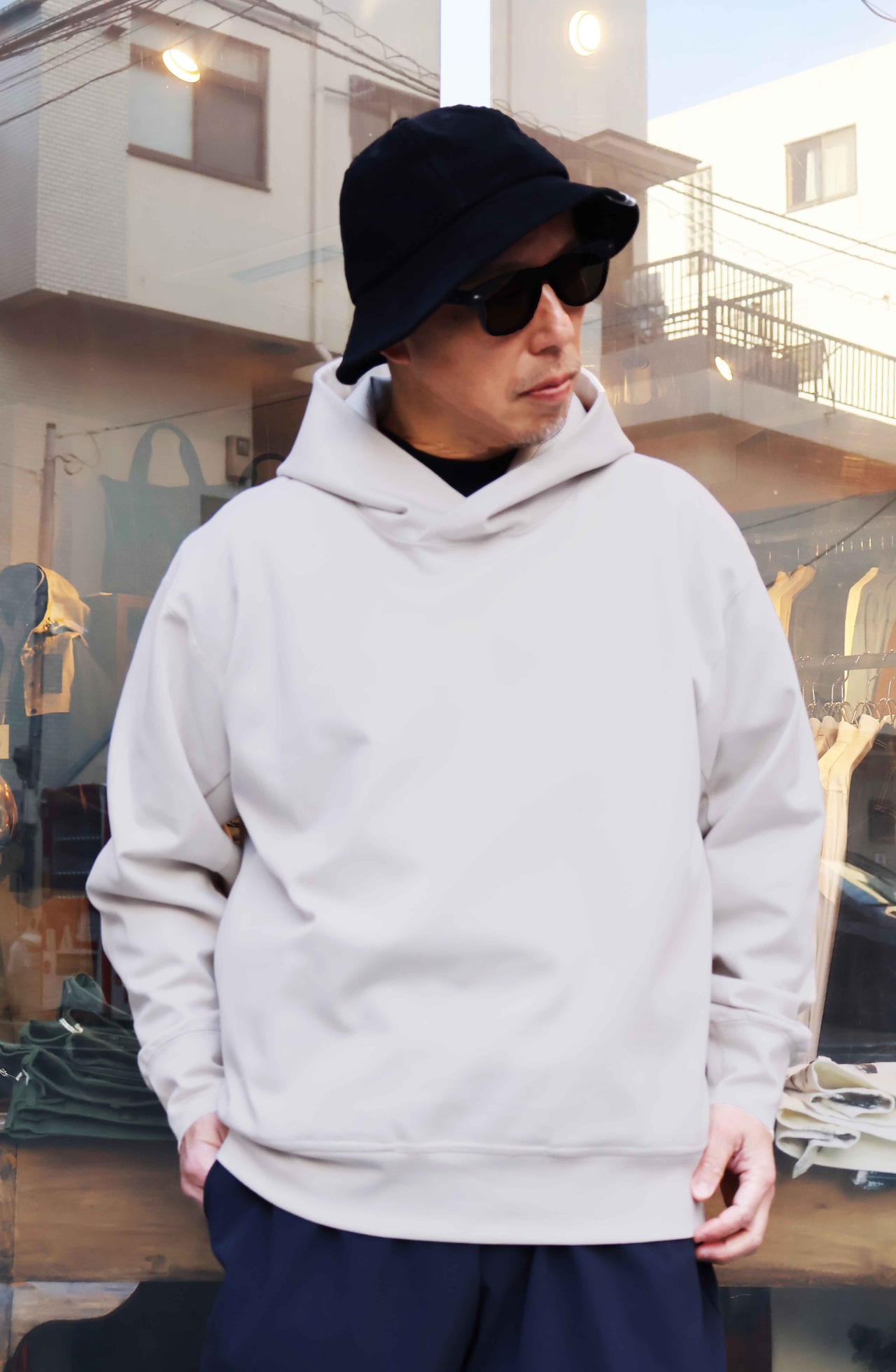 こちらはPERS PROJECTS RILEY P/O PARKAになります。生地には適度にハリ感がありながらも、もっちりとした肉感とストレッリ性が高くキックバック性にも優れたジャージ素材を使用。一般的な裏毛や裏起毛のスウエット生地とは違い、裏地がループ状になっていたり起毛していない、表地と同様にツルっとした表面なので、これからの時期にピッタリな生地となっております。デザインはオールドのスウェットパーカで見られる首元で重なるフード仕様により、綺麗なフードの形状を実現。また両脇にはシームポケットをを配し、いわゆるパーカーに多くみられるカンガルーポケットには無いミニマムな雰囲気を演出し、更に袖はハギを入れる事により立体的なシルエットを形成。一見シンプルですが、実は各所に隠し味を効かせたPERS PROJECTSらしいパーカーに仕上がっております。是非お試しください。