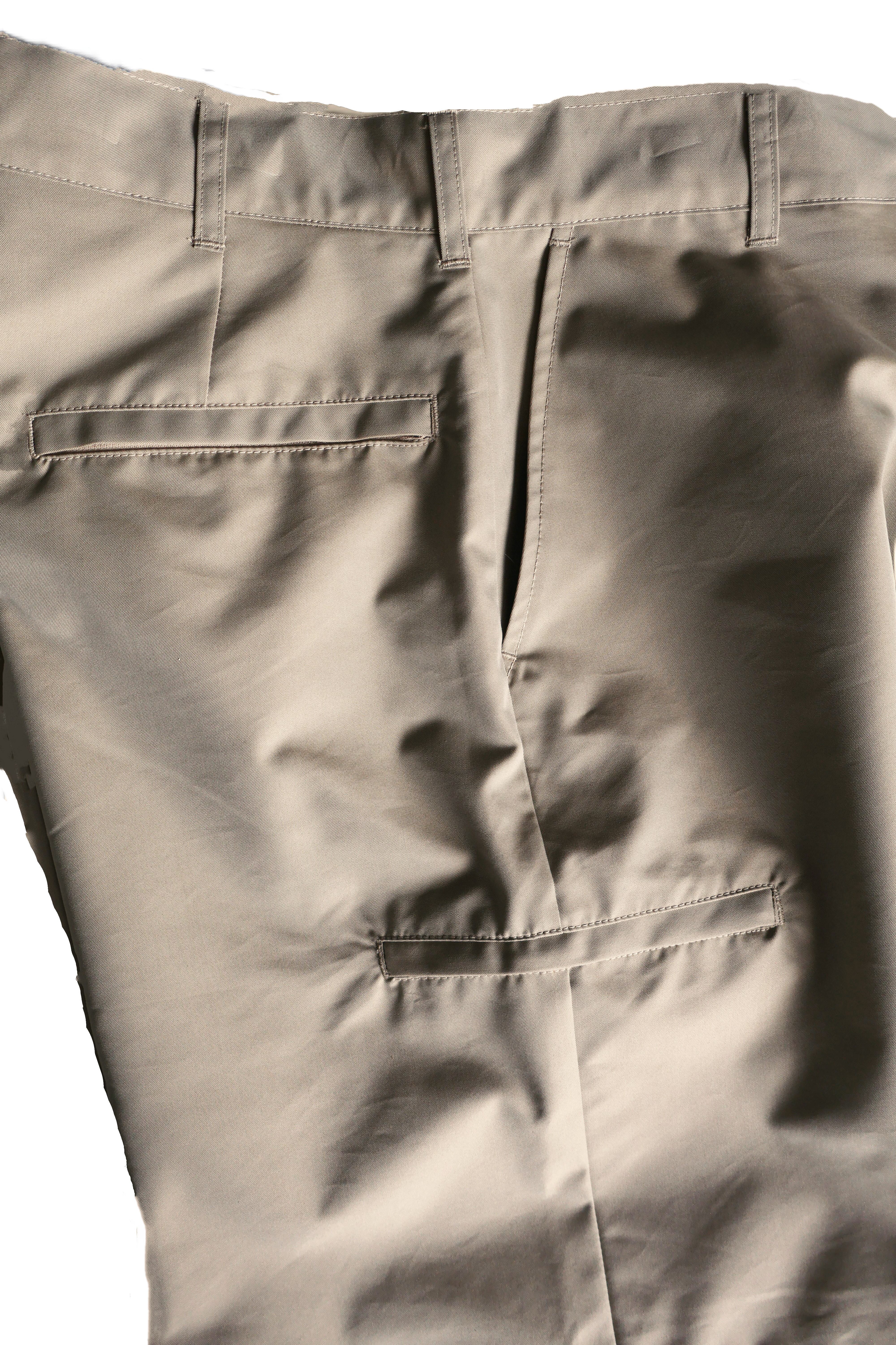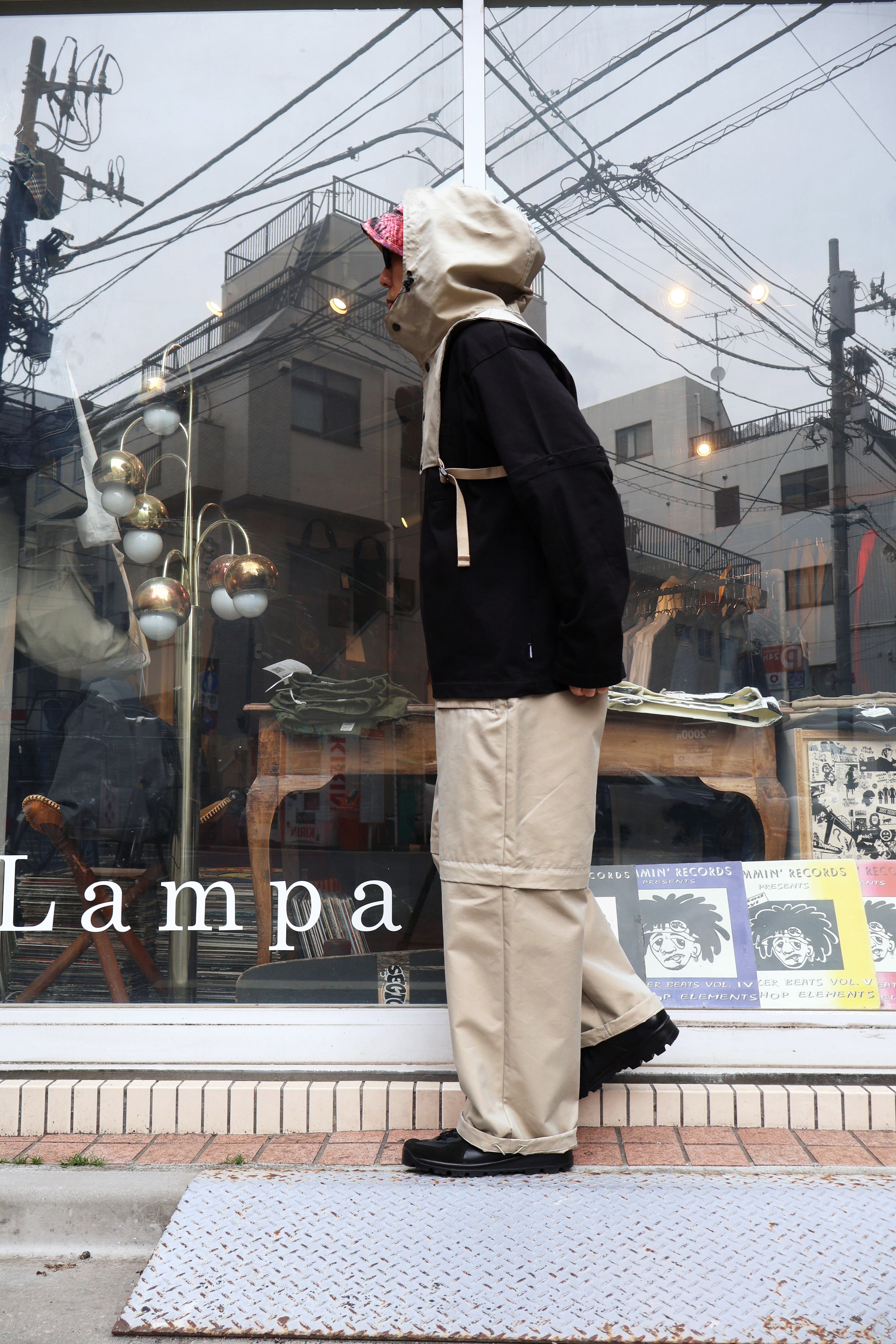 こちらはMODMNT UNIFORM PANTSになります。生地には高機能素材であるベントーネを使用。ベンタイルの製造技術を応用しコットンとポリエステルを高密度に織り上げ、ソフト加工、ピーチ加工、撥水加工を施す事により、しっかりとした安心感ある生地感ながらも滑らで肌触りが良く、更に撥水性を持った生地になります。デザインは全体的にゆったりとし軽くテーパードがかったシルエットに、ウエストはイージー仕様を採用。また左前身頃と右脇、ヒップ部分にはジップポケットを配し、裾にはドローコードによりシルエットの調整が可能。更にこのパンツの一番の特徴であるシップによる着脱によりショーツとしても履ける2WAYデザインを採用。太めのシルエットや右脇のポケットの雰囲気などから、どことなくDICKIESのパンツを連想させる、MODMNTらしいアメカジ感ある機能的なパンツに仕上がっております。是非お試しください。